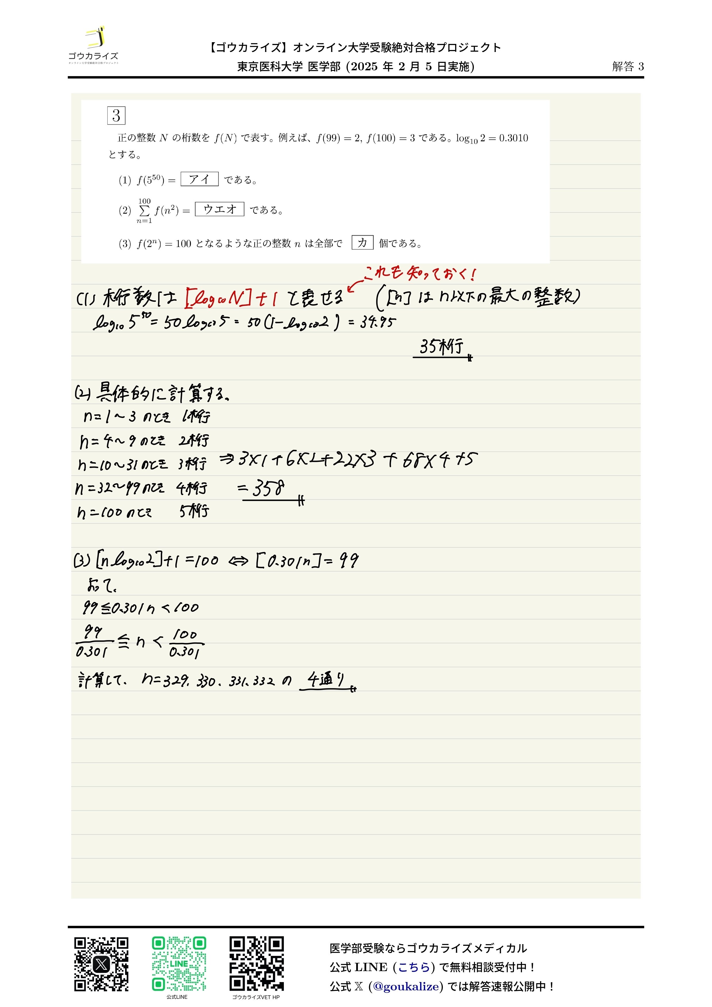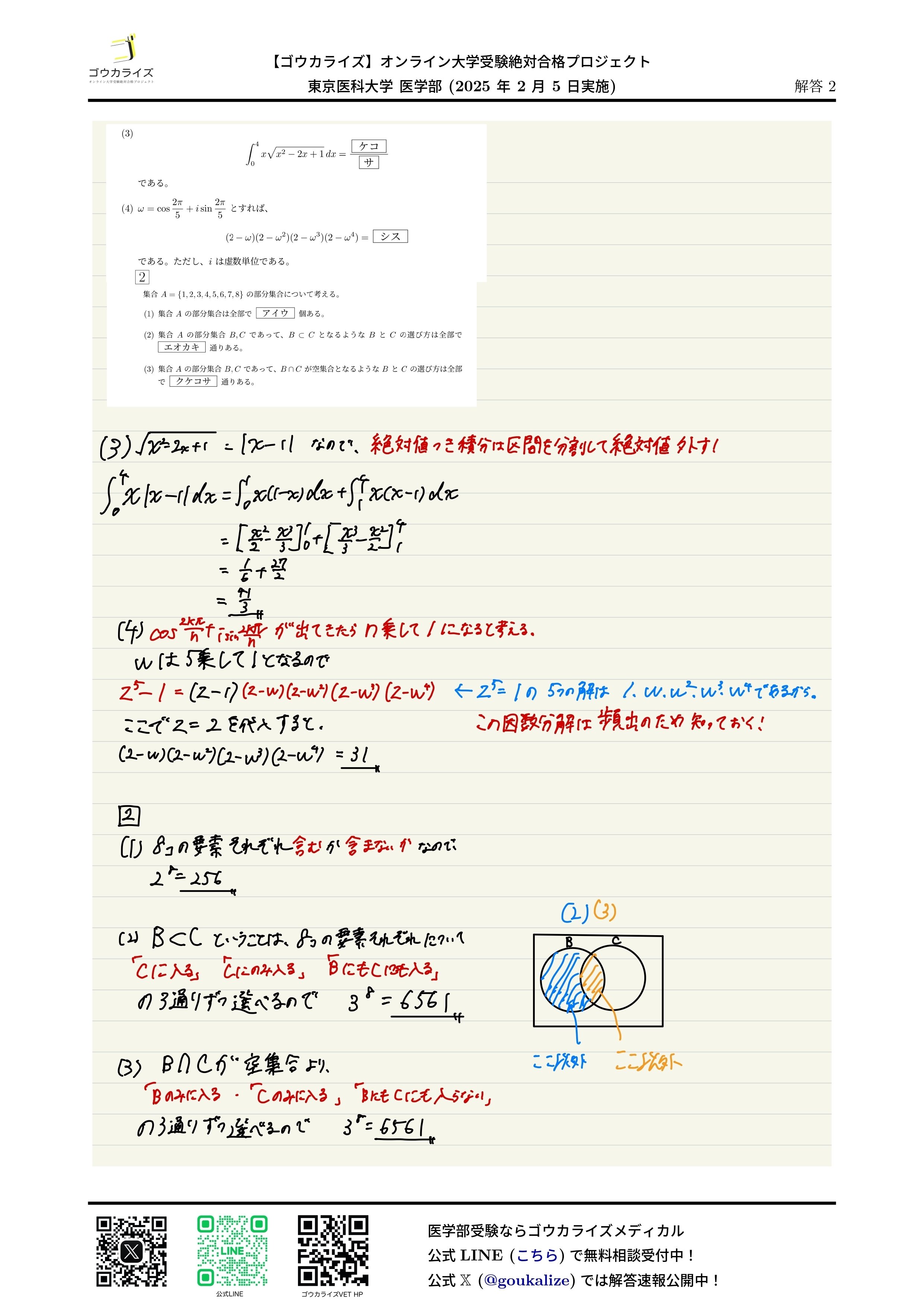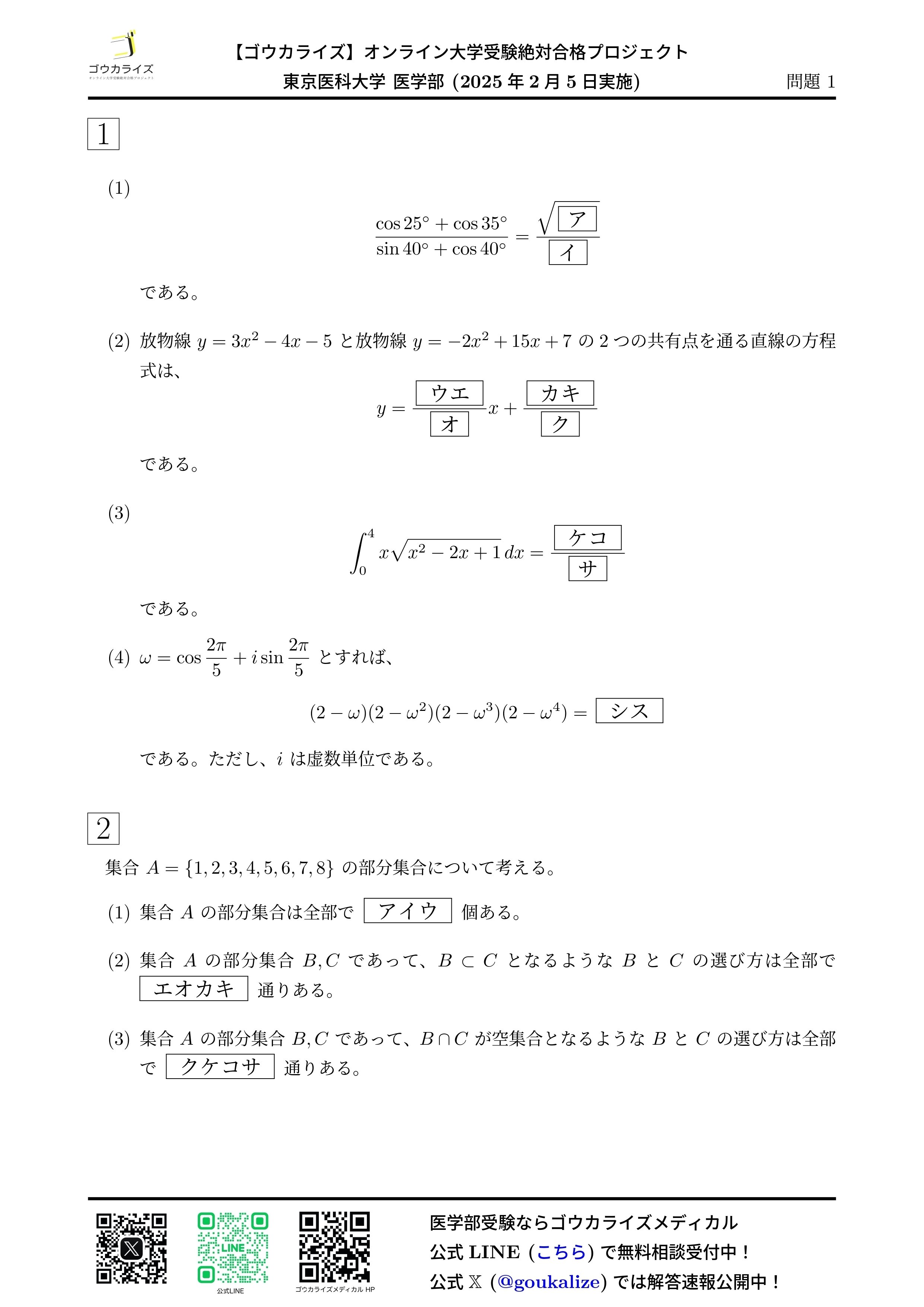 2025年 東京医科大学 医学部 (2/5実施) 数学 解答速報 【ゴウカライズ】