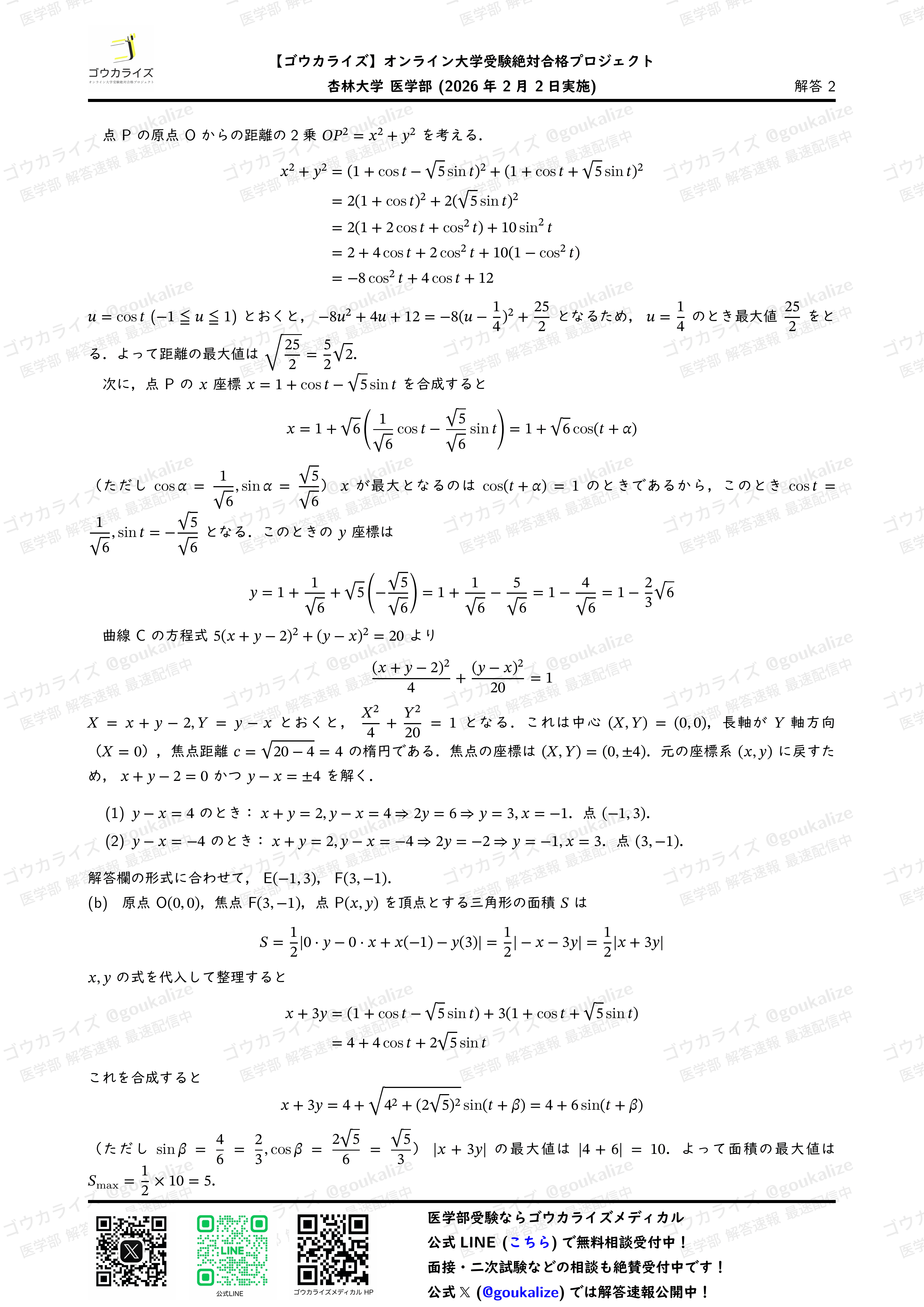 2026/2/2実施の杏林大学医学部 医学部の数学の解答速報です。