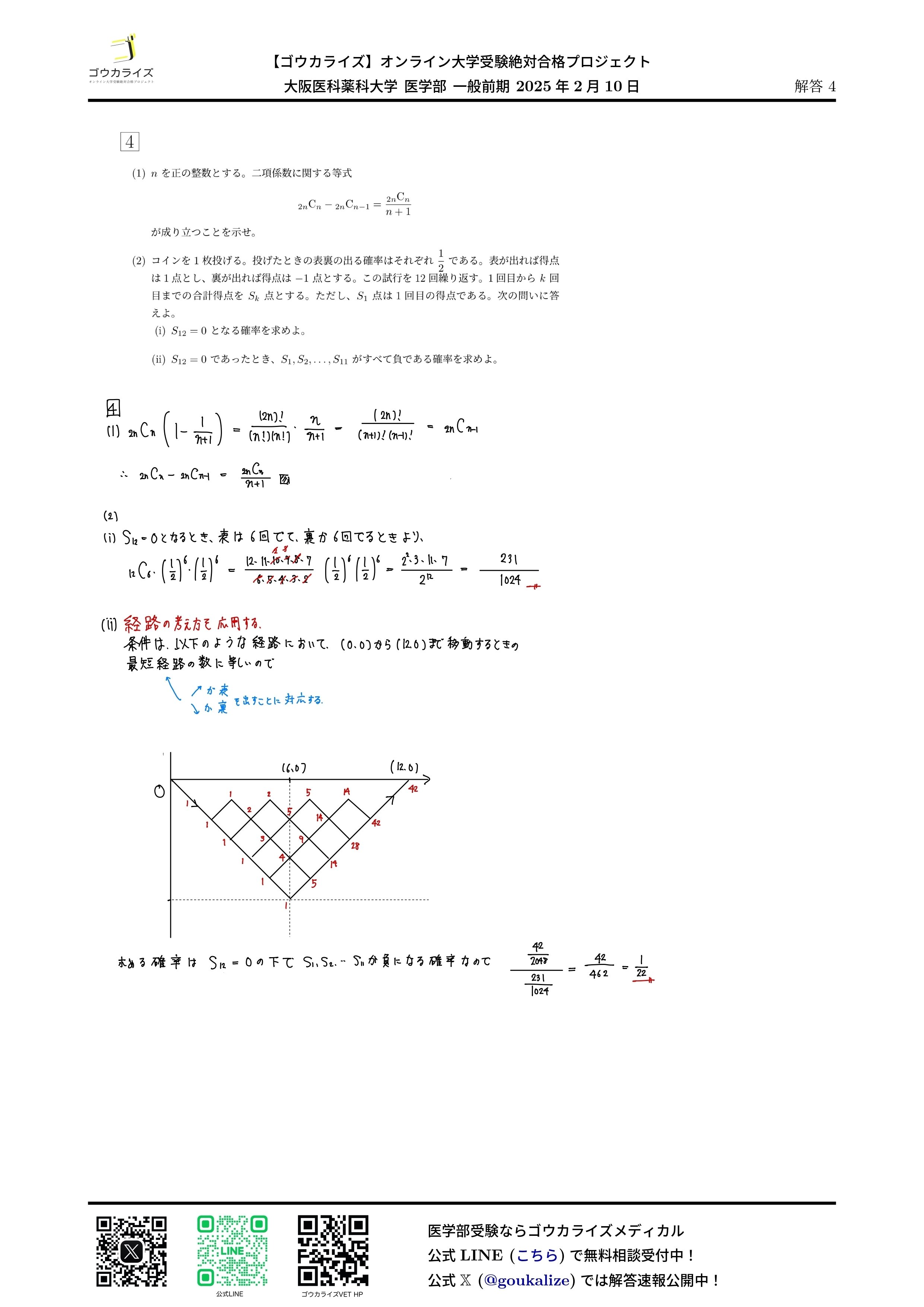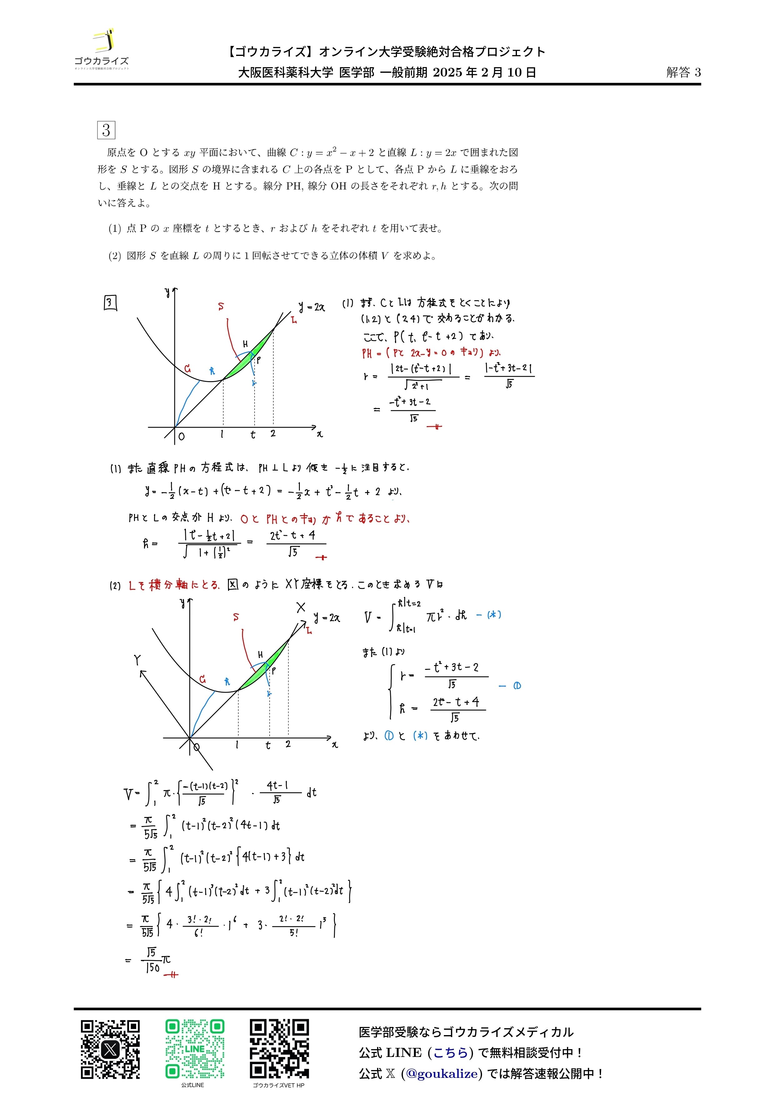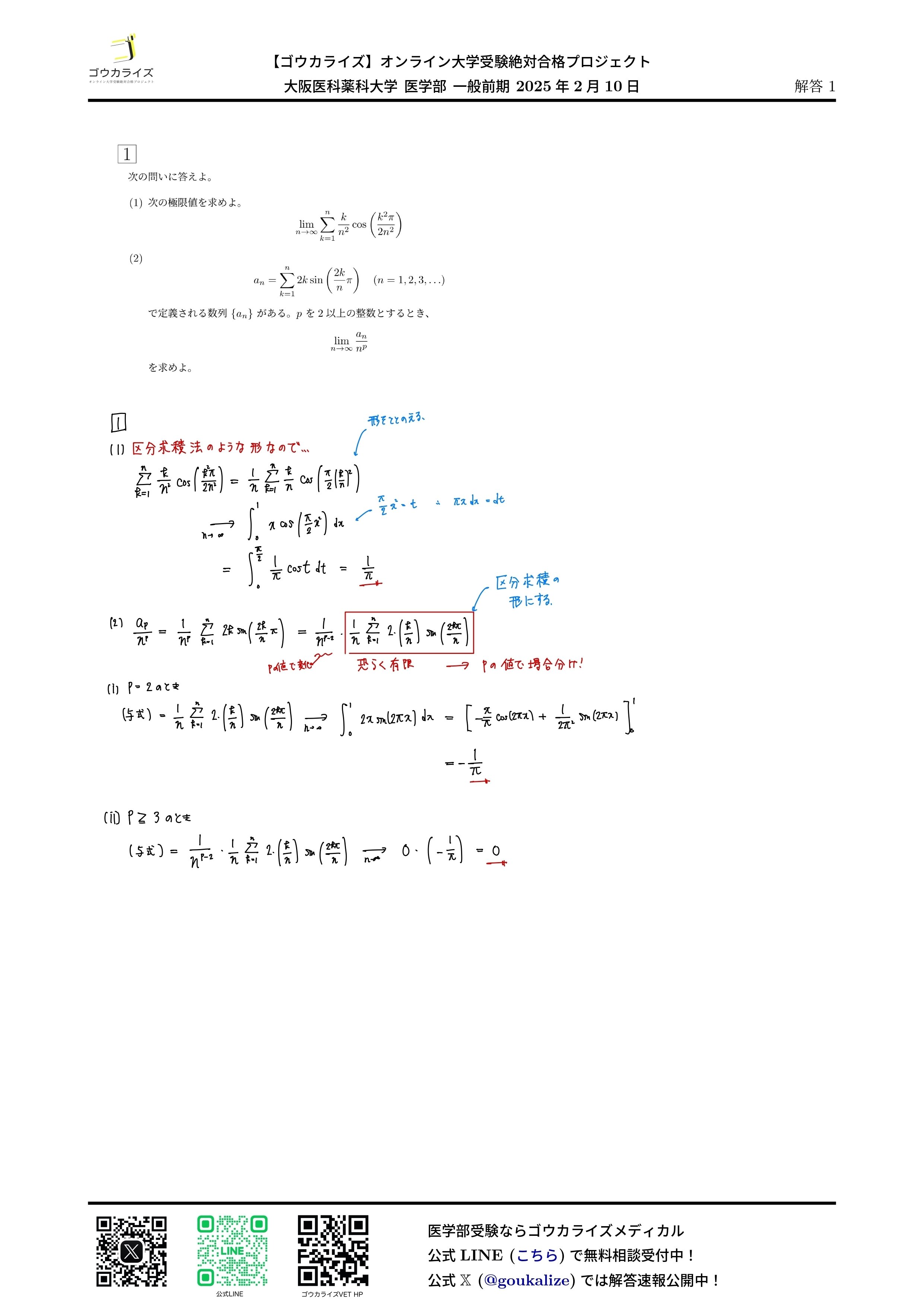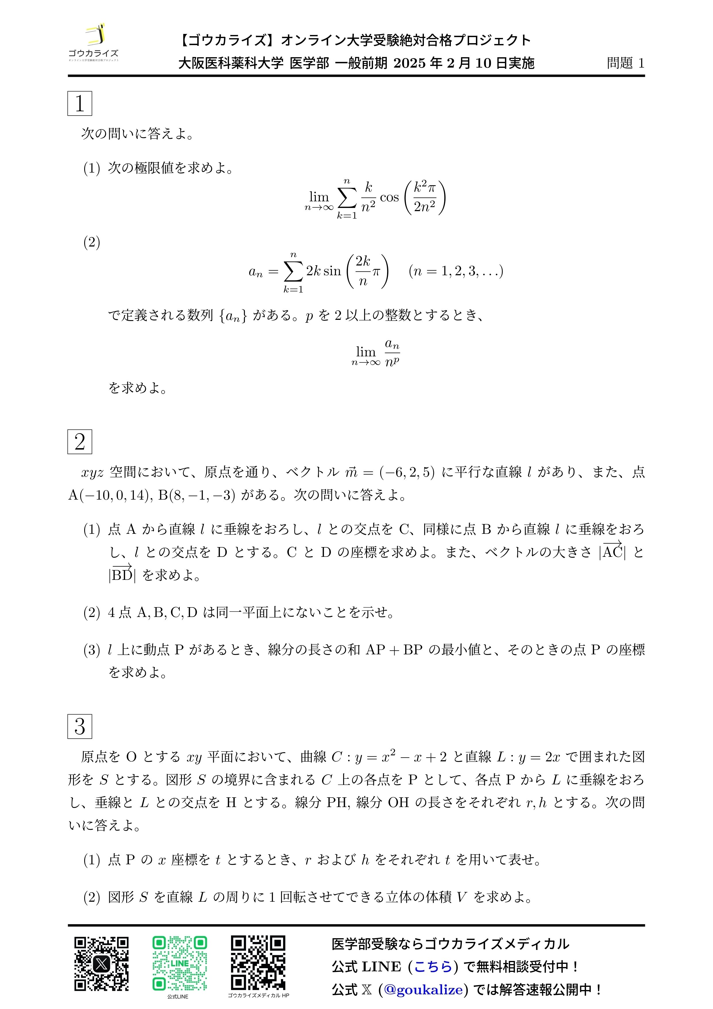 2025年2月10日行われた大阪医科薬科大学 医学部 一般前期試験の数学解答速報です