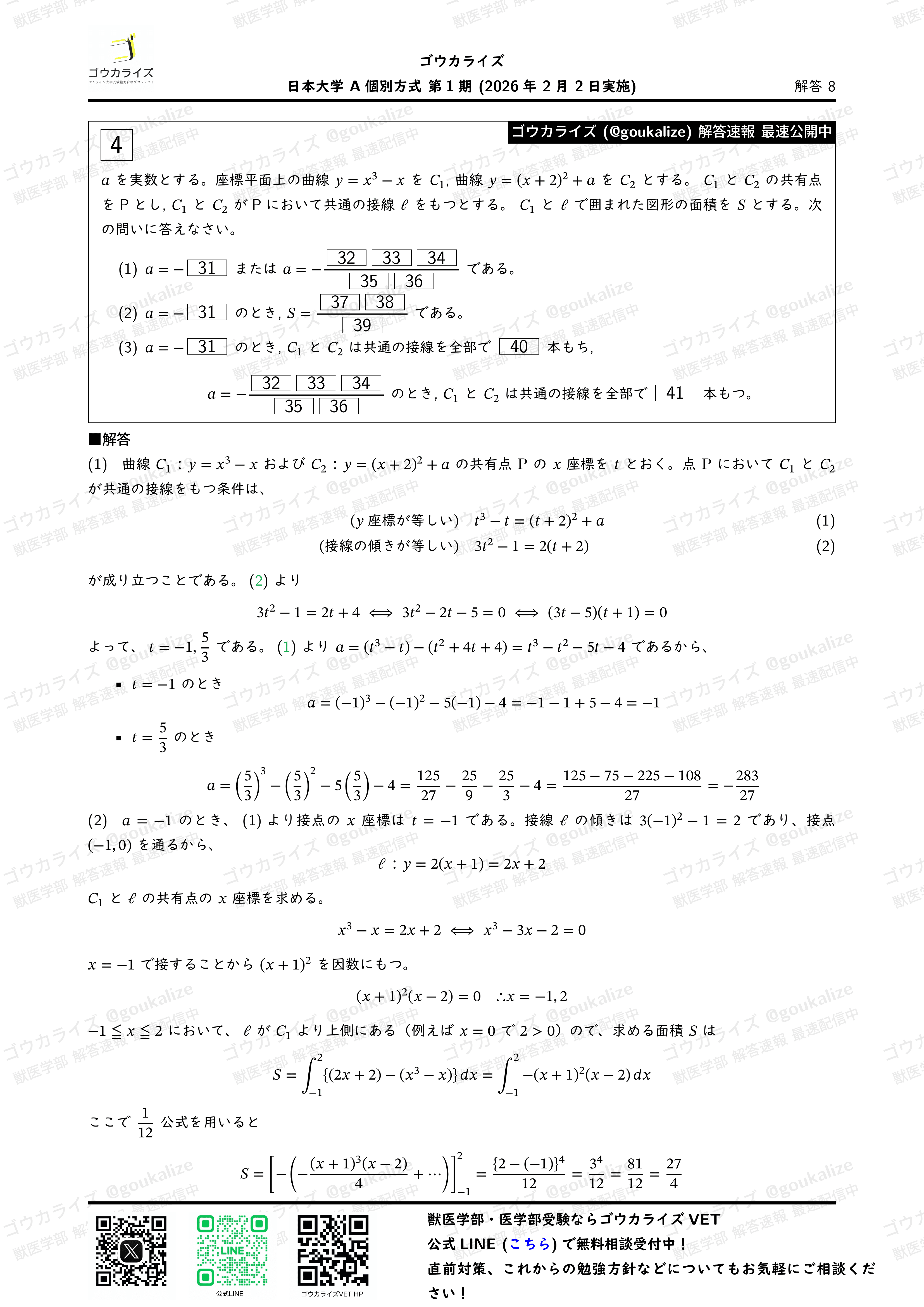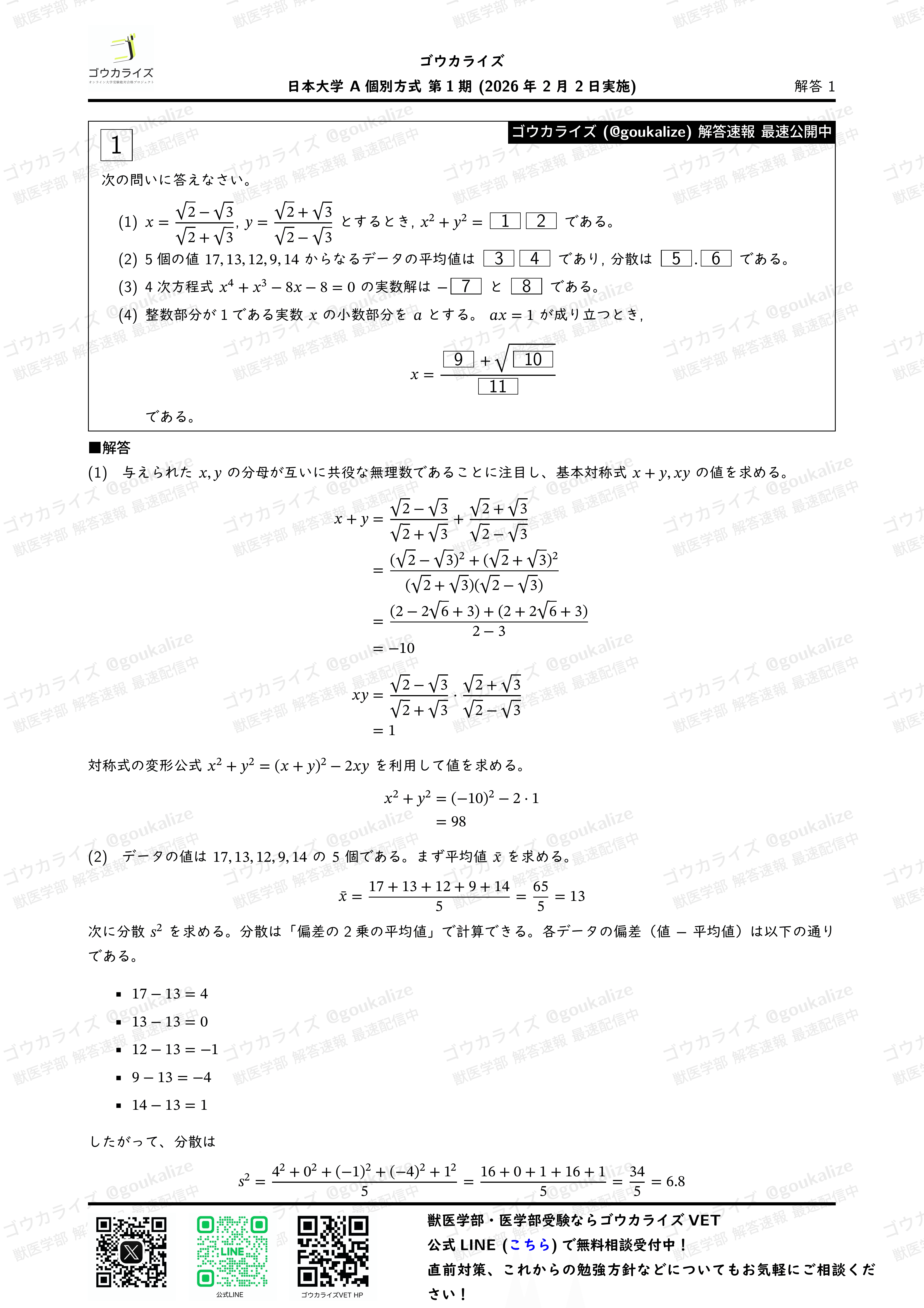 2026/02/02実施の日本大学 A個別方式第1期の解答速報です。