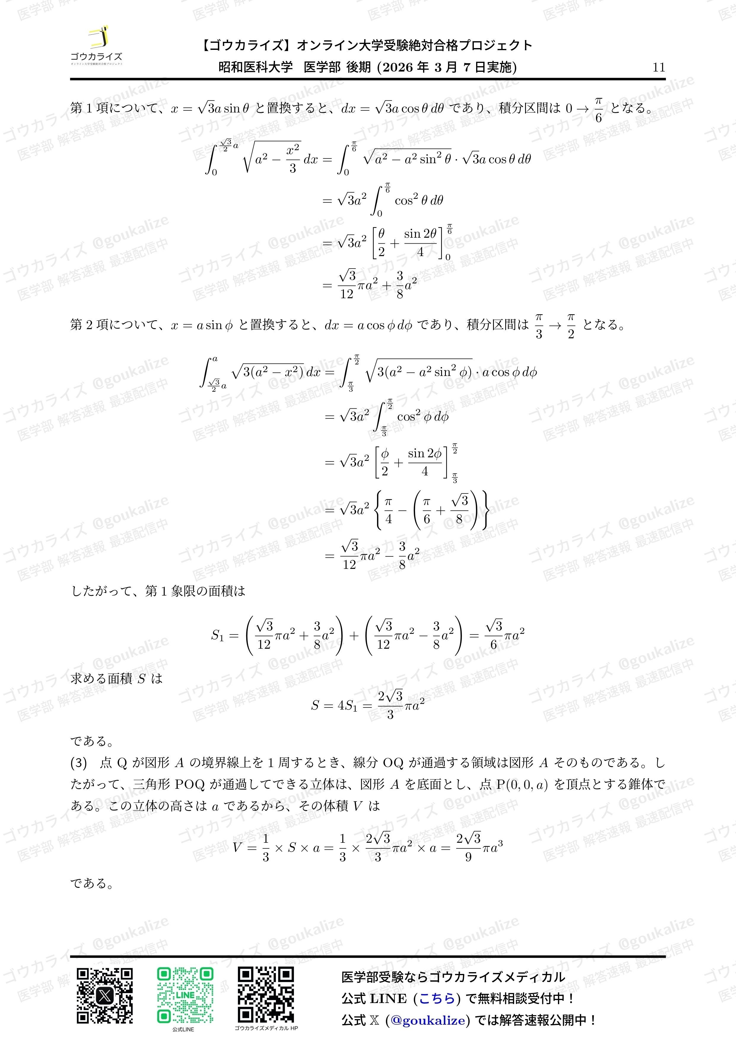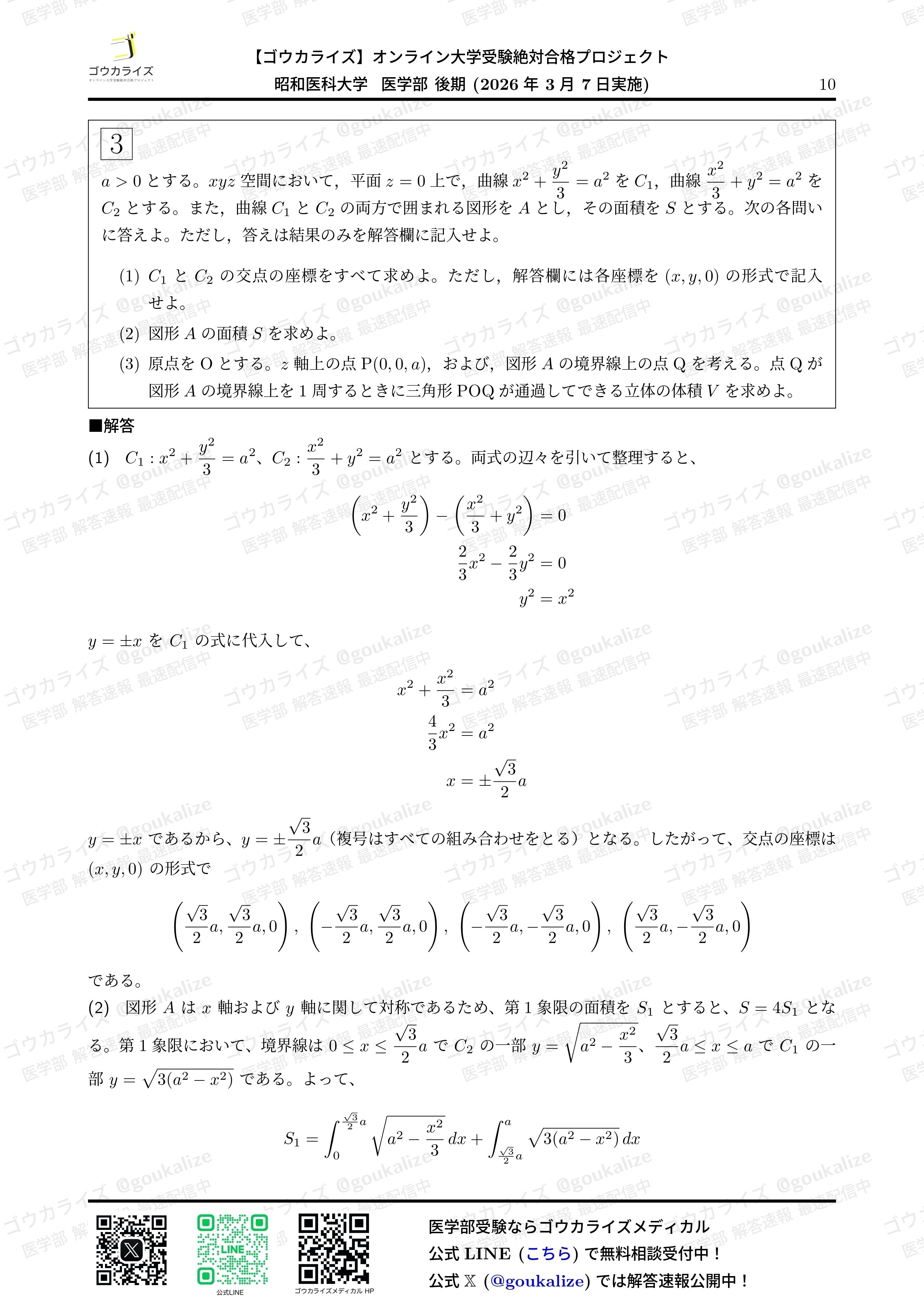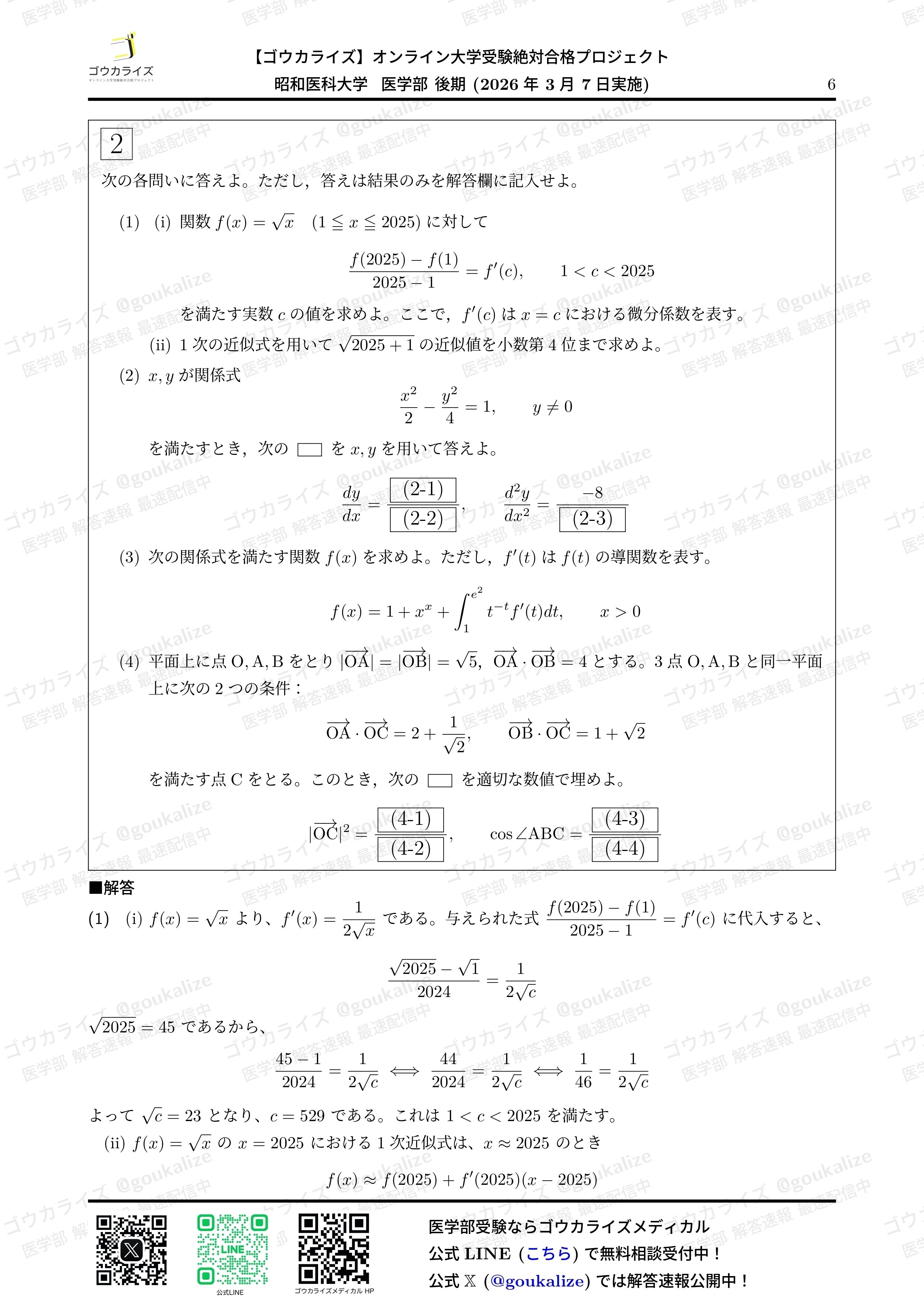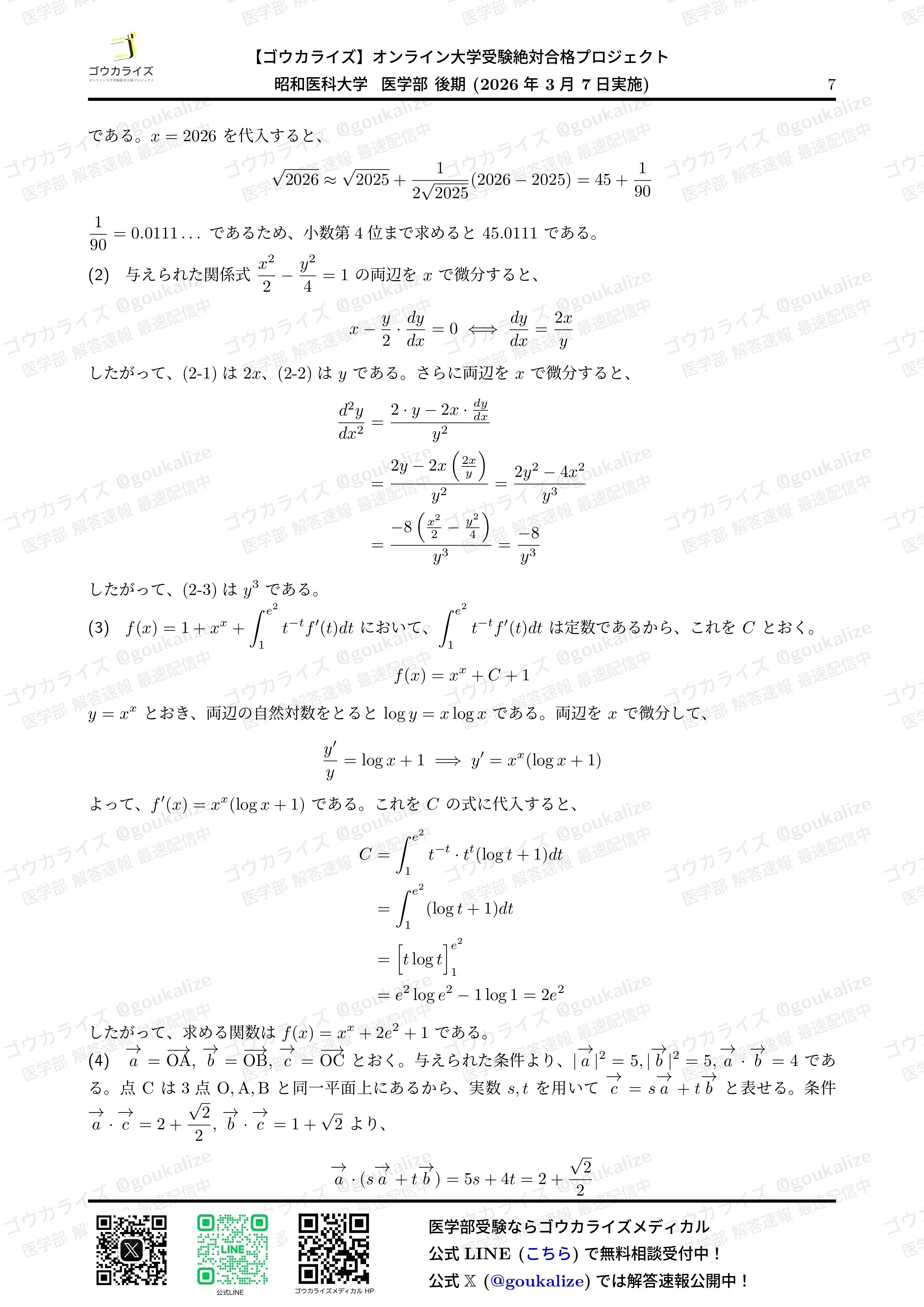 2026/3/7 実施の 昭和医科大学 II期 数学 の解答速報です。