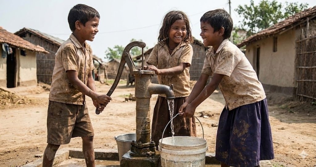 「アジアの貧困地域と思われる場所で、井戸から水を汲んでいる子供たちの写真」
