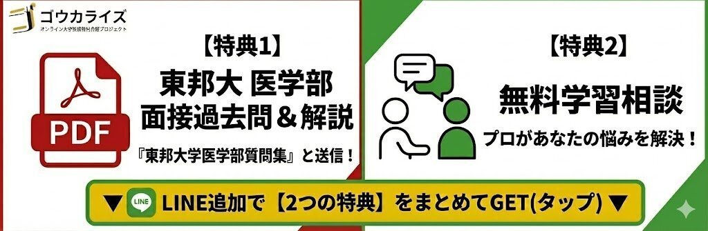 「東邦大学医学部 面接質問集(PDF)」では、過去に報告された質問への回答例と詳しい解説をすべて網羅しています。LINE追加で無料でお送りします!
