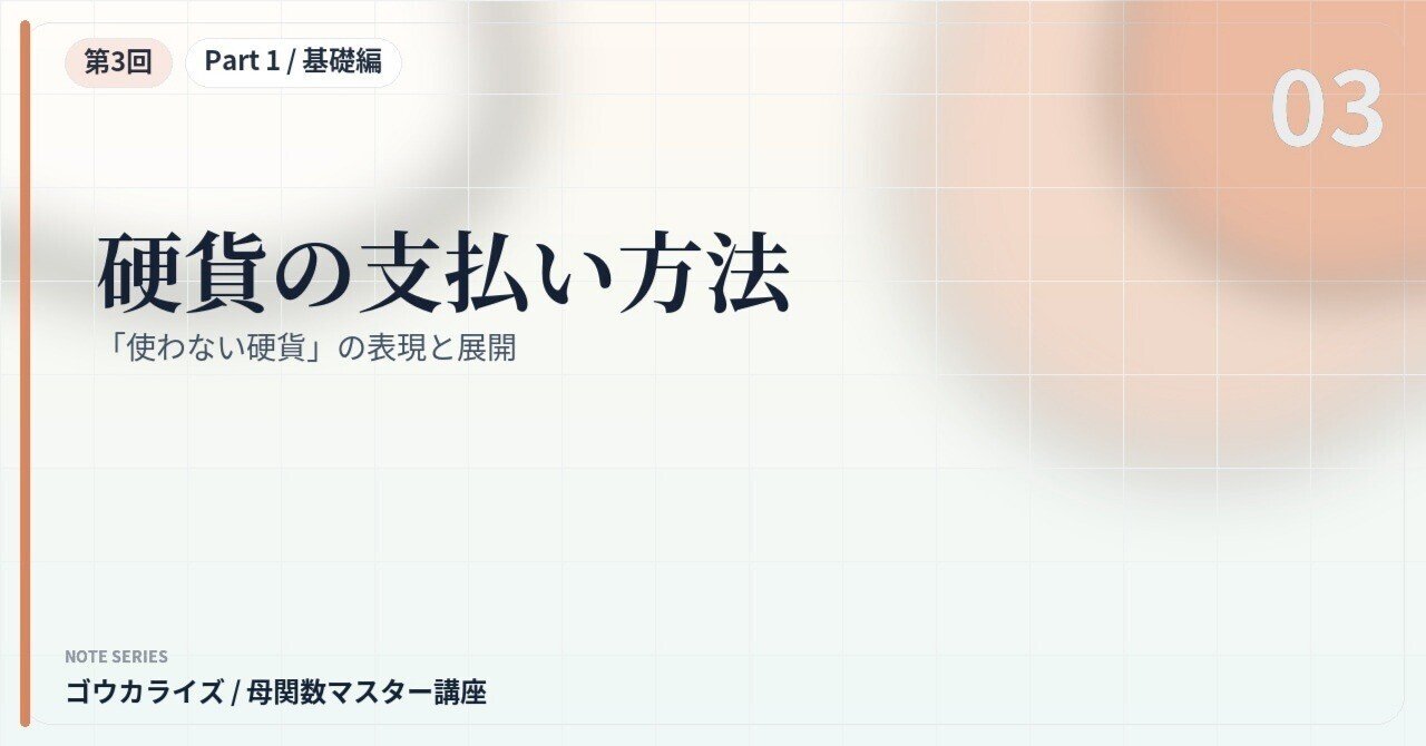 今回は、入試問題や網羅系参考書で頻出の「硬貨の支払い方法」を題材にします。サイコロとは少し違う「使わない硬貨がある」「金額が異なる」という条件を、母関数でどのように処理するのかを見ていきましょう。