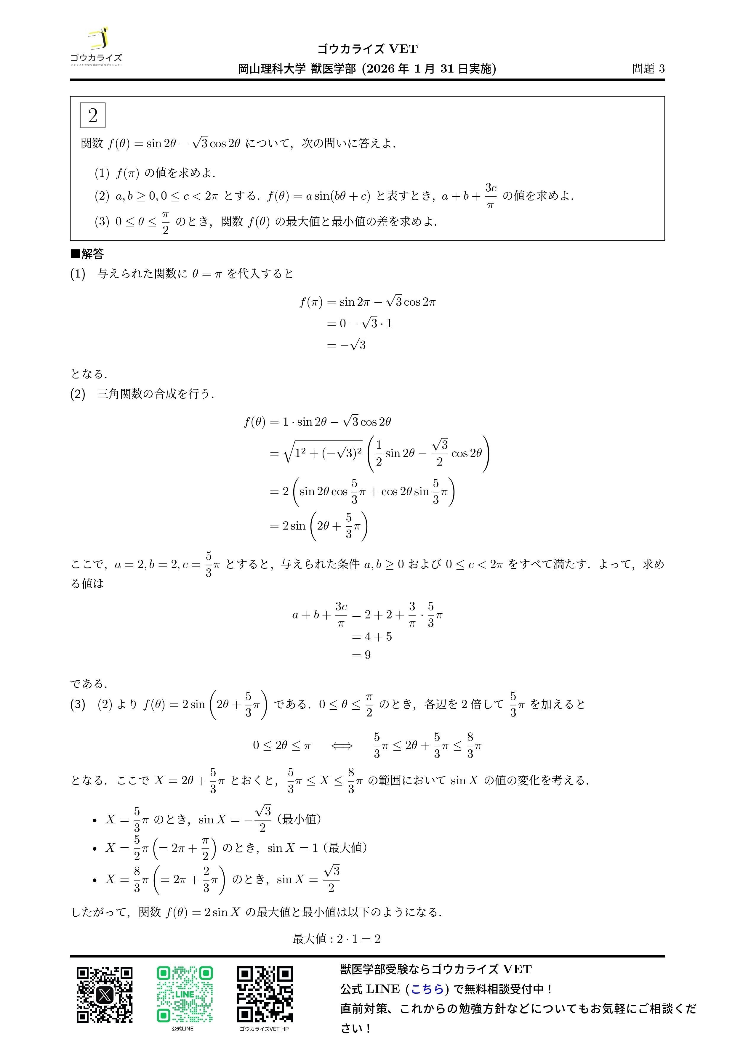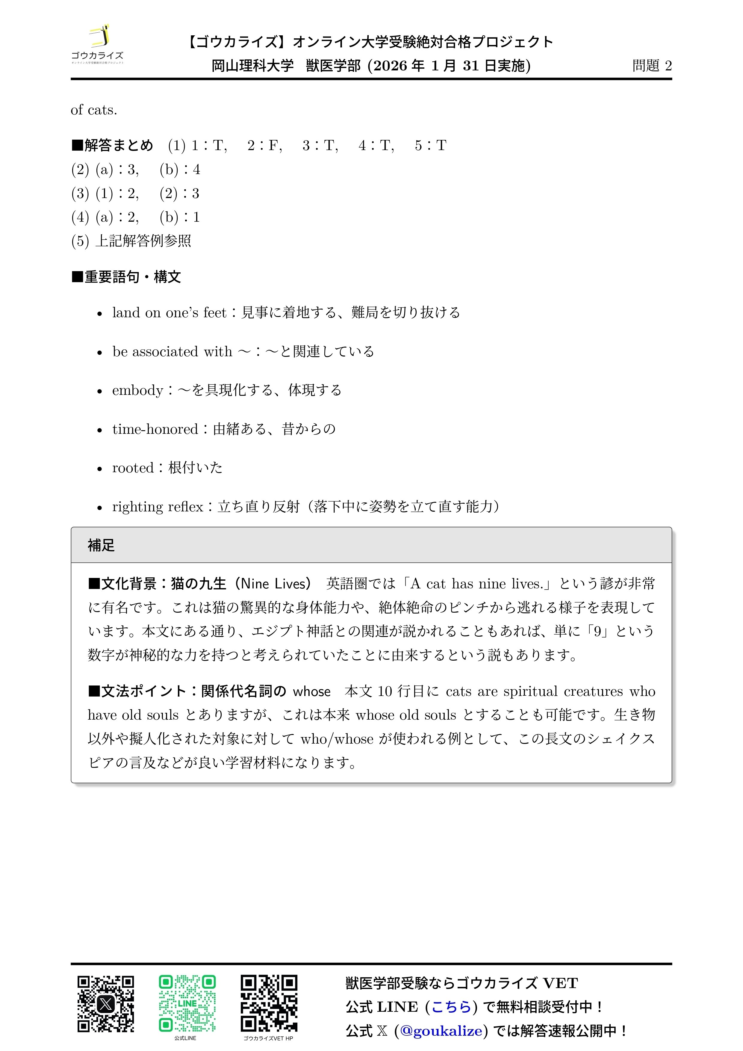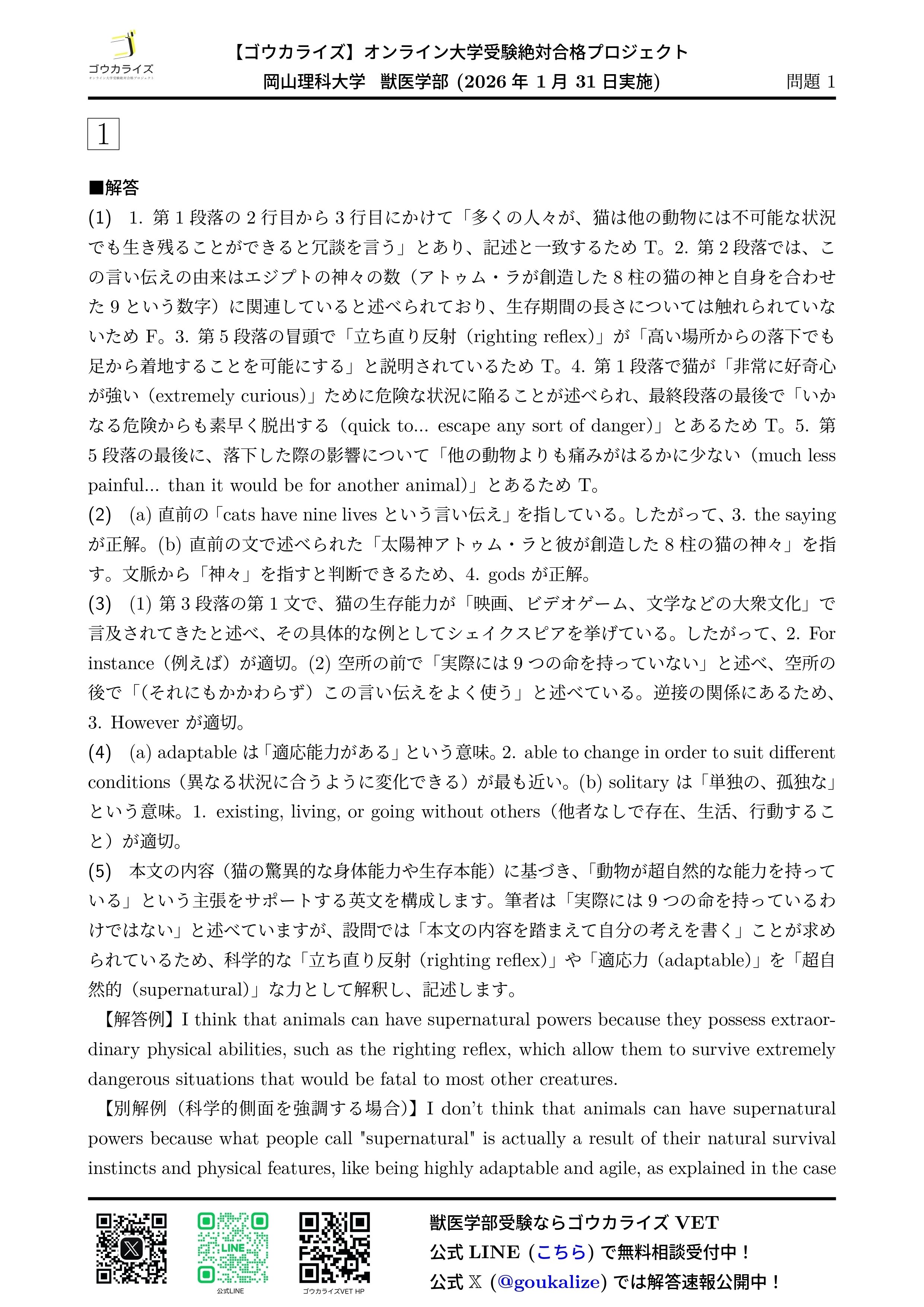 【2026年解答速報】岡山理科大学 獣医学部 前期B日程 全科目 (1/31実施) 【完成】