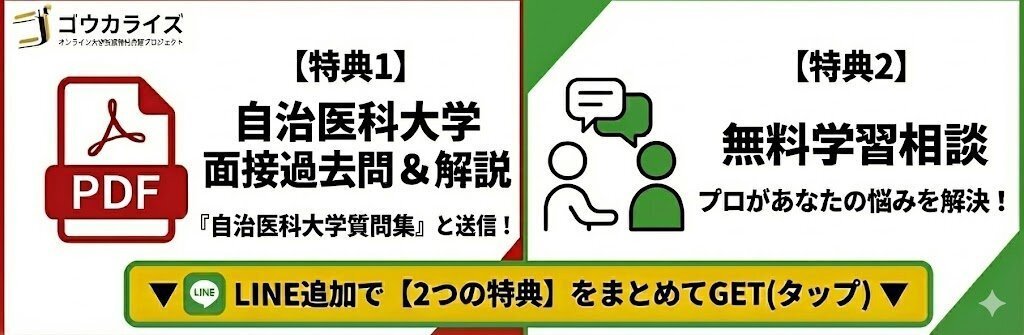 「自治医科大学医学部 面接質問集(PDF)」では、過去に報告された質問への回答例と詳しい解説をすべて網羅しています。LINE追加で無料でお送りします!