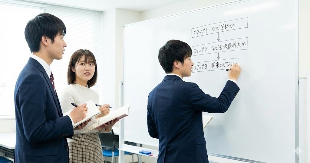 まず「なぜ医師か」という根本の動機を明確にします。これは金沢医科大学に限らずどの医学部でも問われる部分ですが、ここで大切なのは具体的なエピソードと結びつけることです。「人の役に立ちたいから」という漠然とした理由ではなく、自分の経験(家族の病気、ボランティア活動、医療現場の見学等)から「医師という職業でなければ実現できない目標」を導き出しましょう。