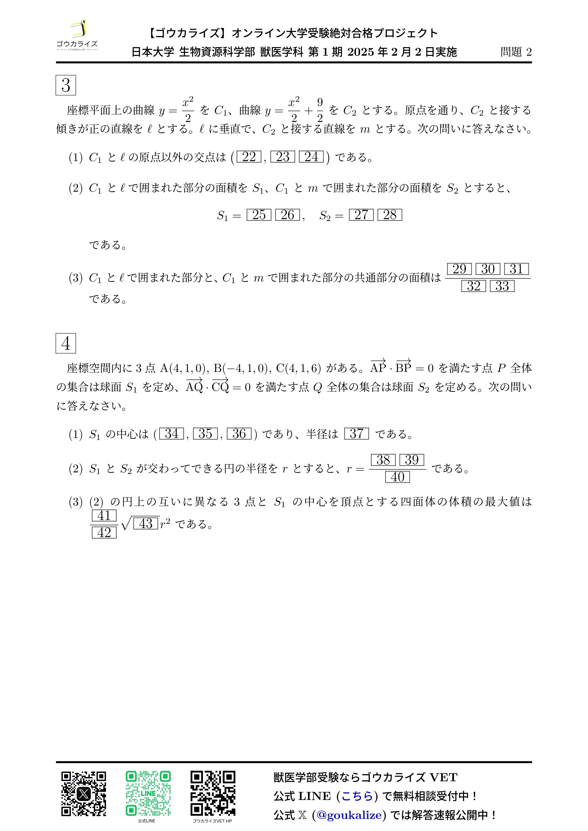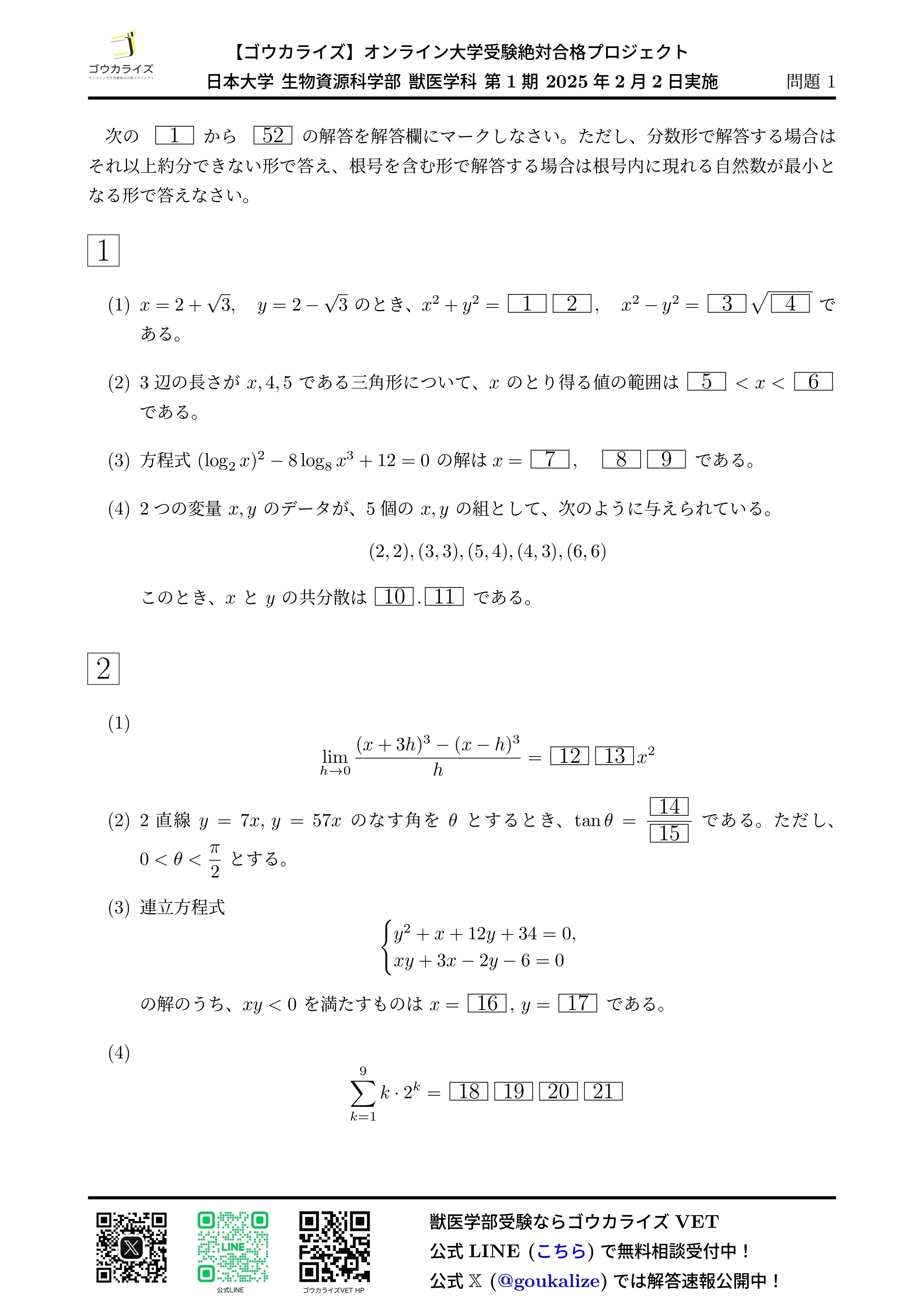 2025年 日本大学 生物資源科学部 獣医学科 第1期 数学 解答速報