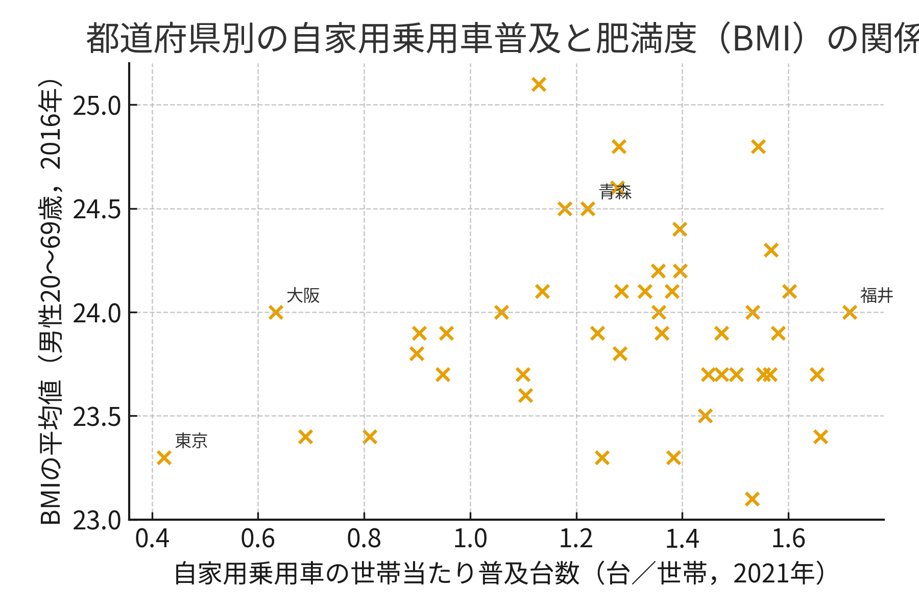 - 自動車保有台数と肥満(BMI)の相関は「弱い正の相関」にとどまり、因果関係は証明していない こと