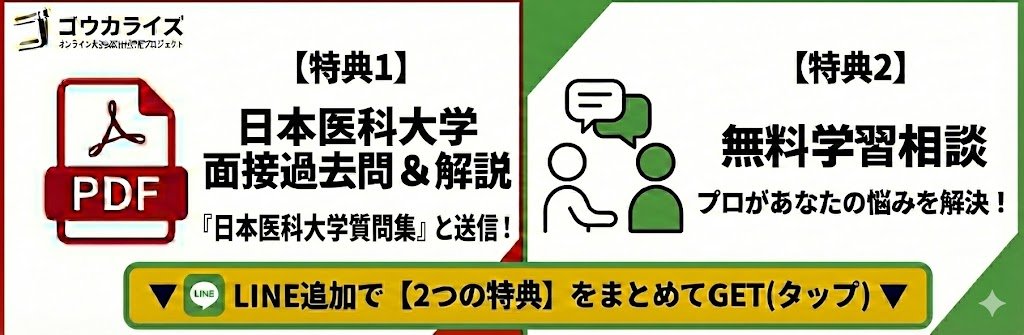 「日本医科大学医学部 面接質問集(PDF)」では、過去に報告された質問への回答例と詳しい解説をすべて網羅しています。LINE追加で無料でお送りします!