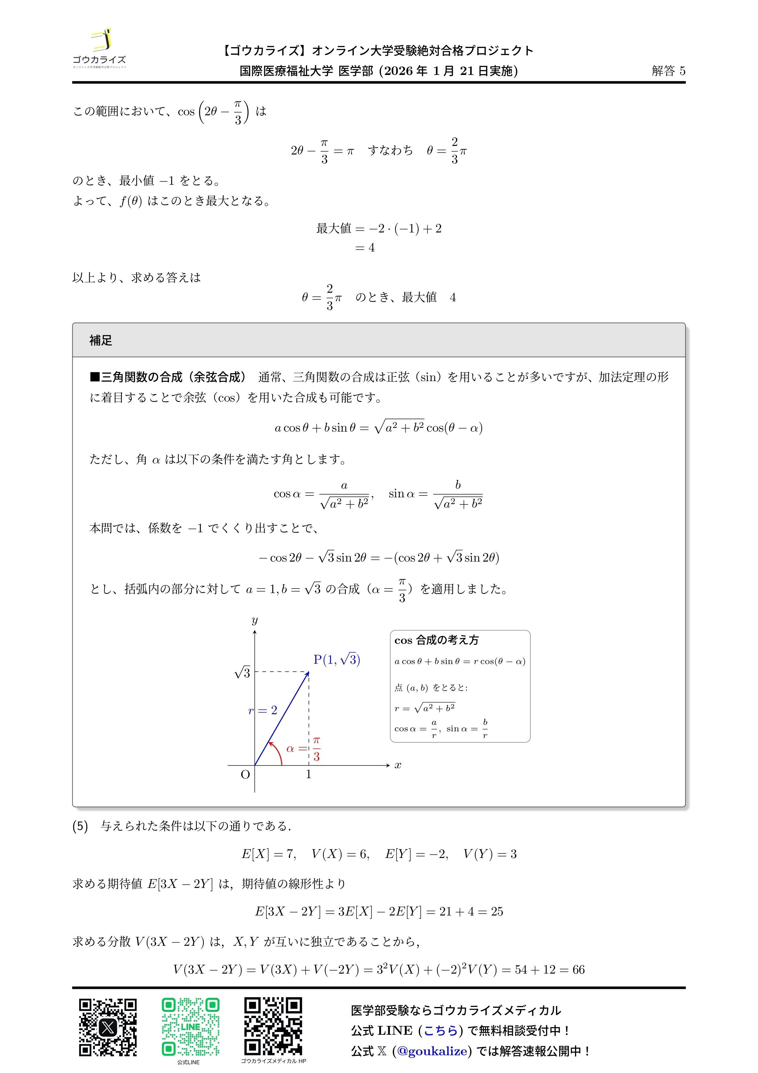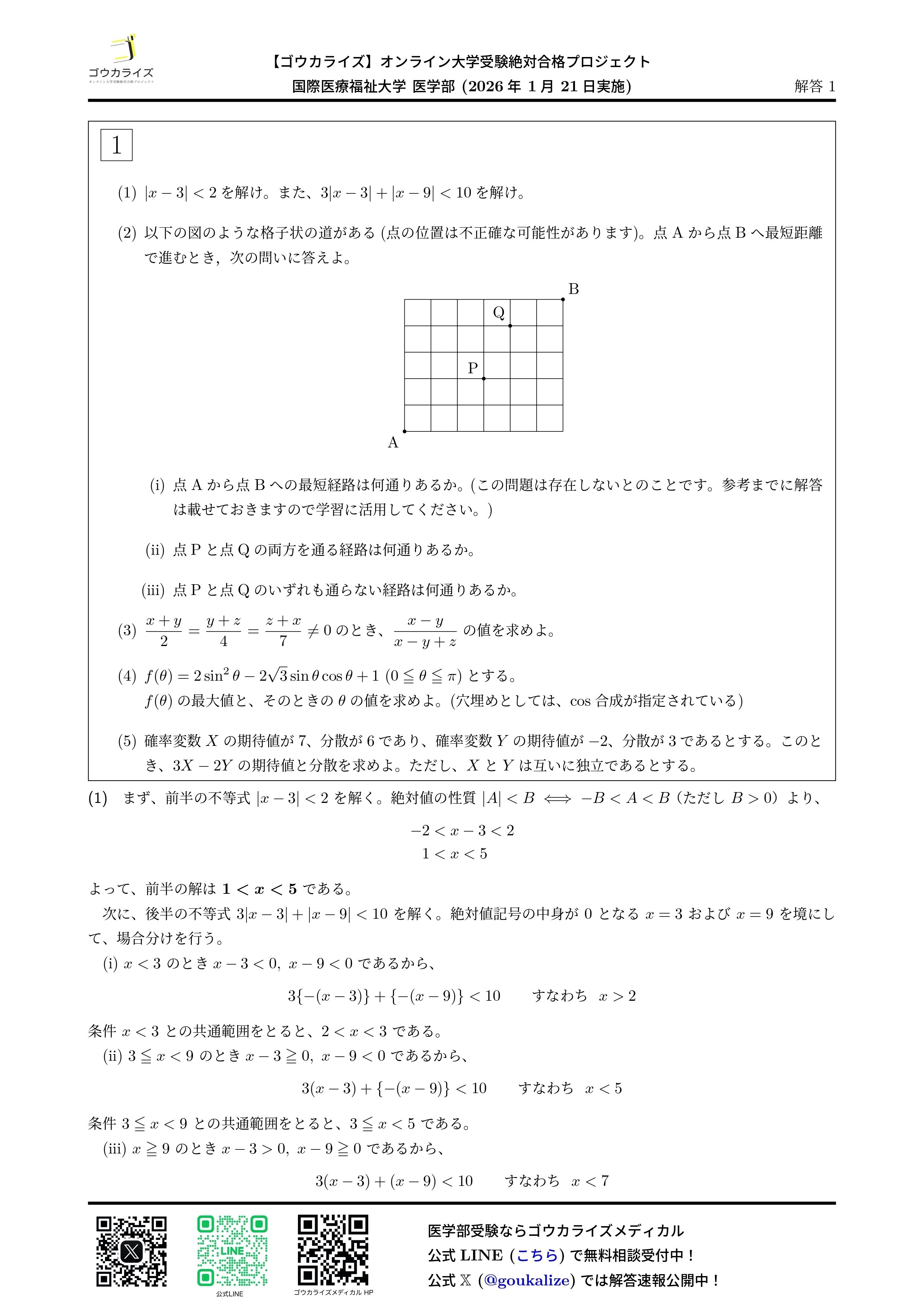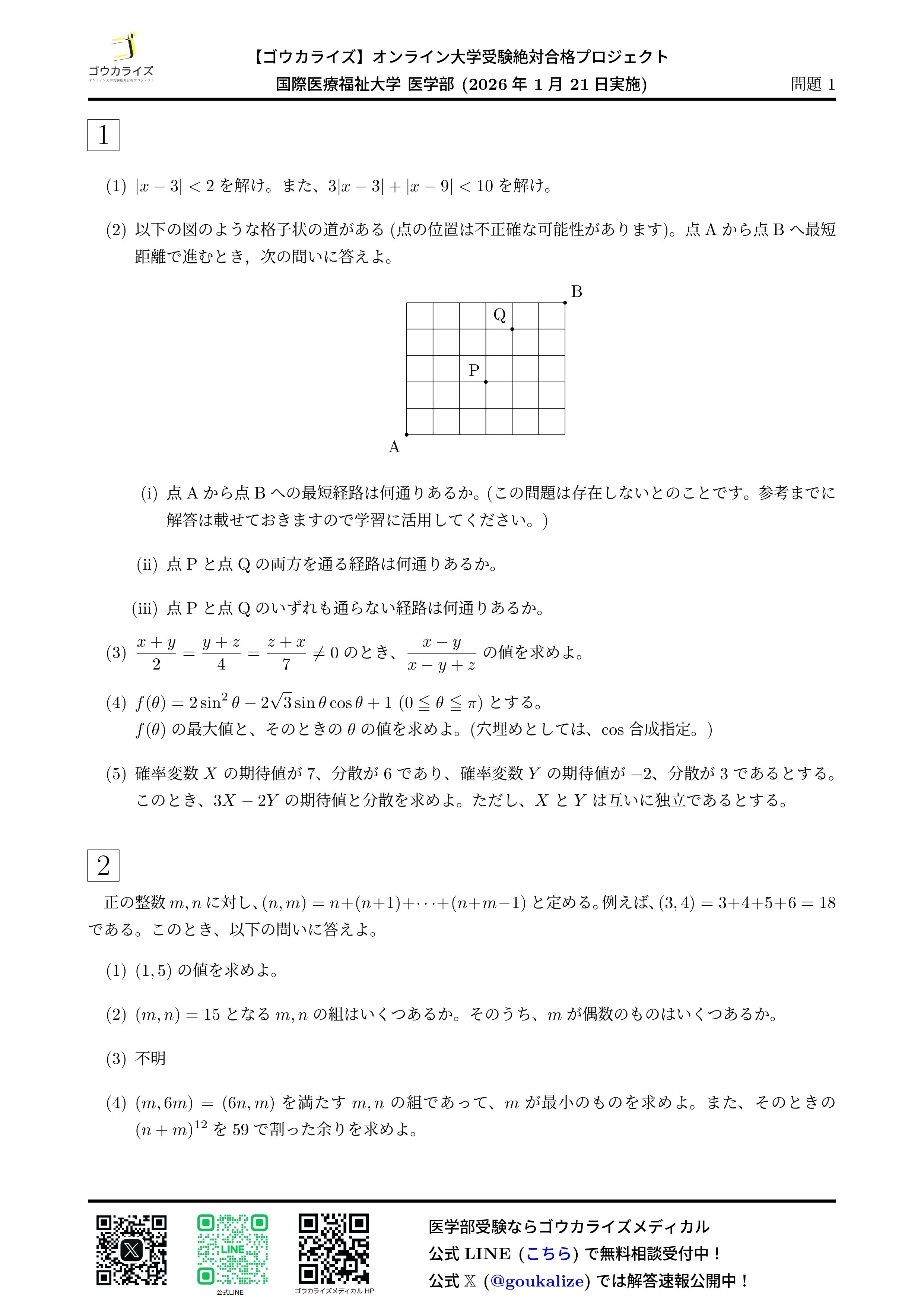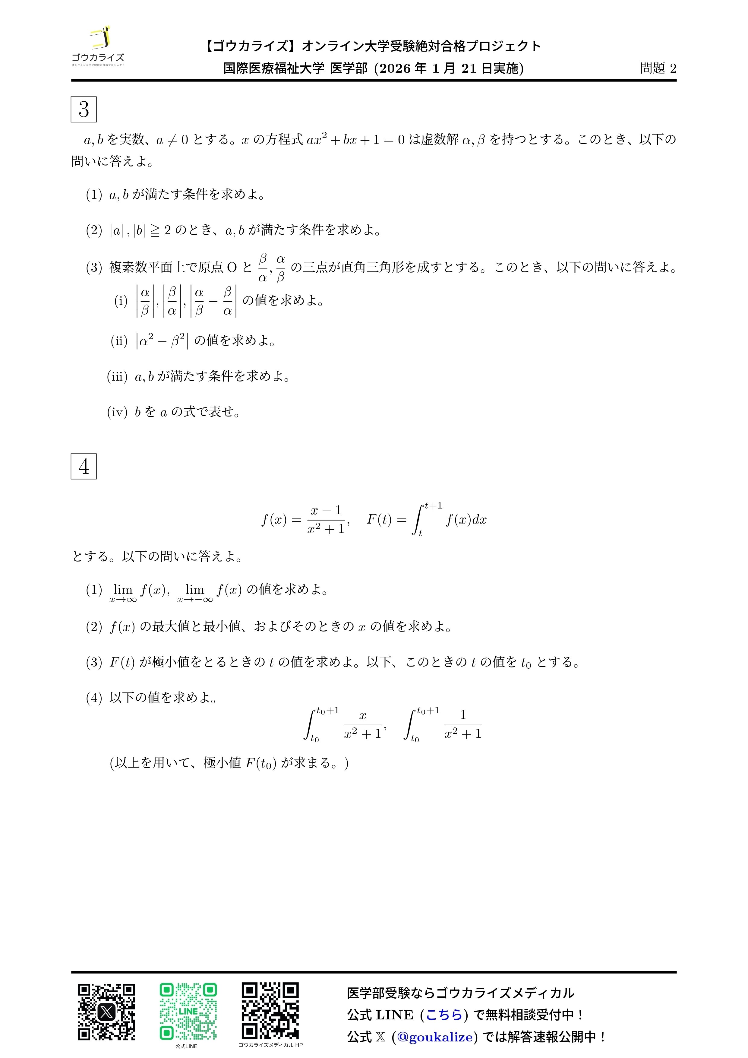 2026/01/21実施の国際医療福祉大学医学部の数学の解答速報です。