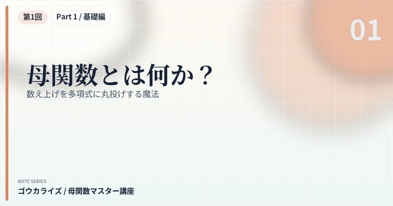 母関数の根本にあるのは、多項式の展開における「カッコから項を1個ずつ選んでかける」というルールです。次回、第2回からは、このルールをサイコロや硬貨の支払いといった、より実戦的な問題に拡張していきます。