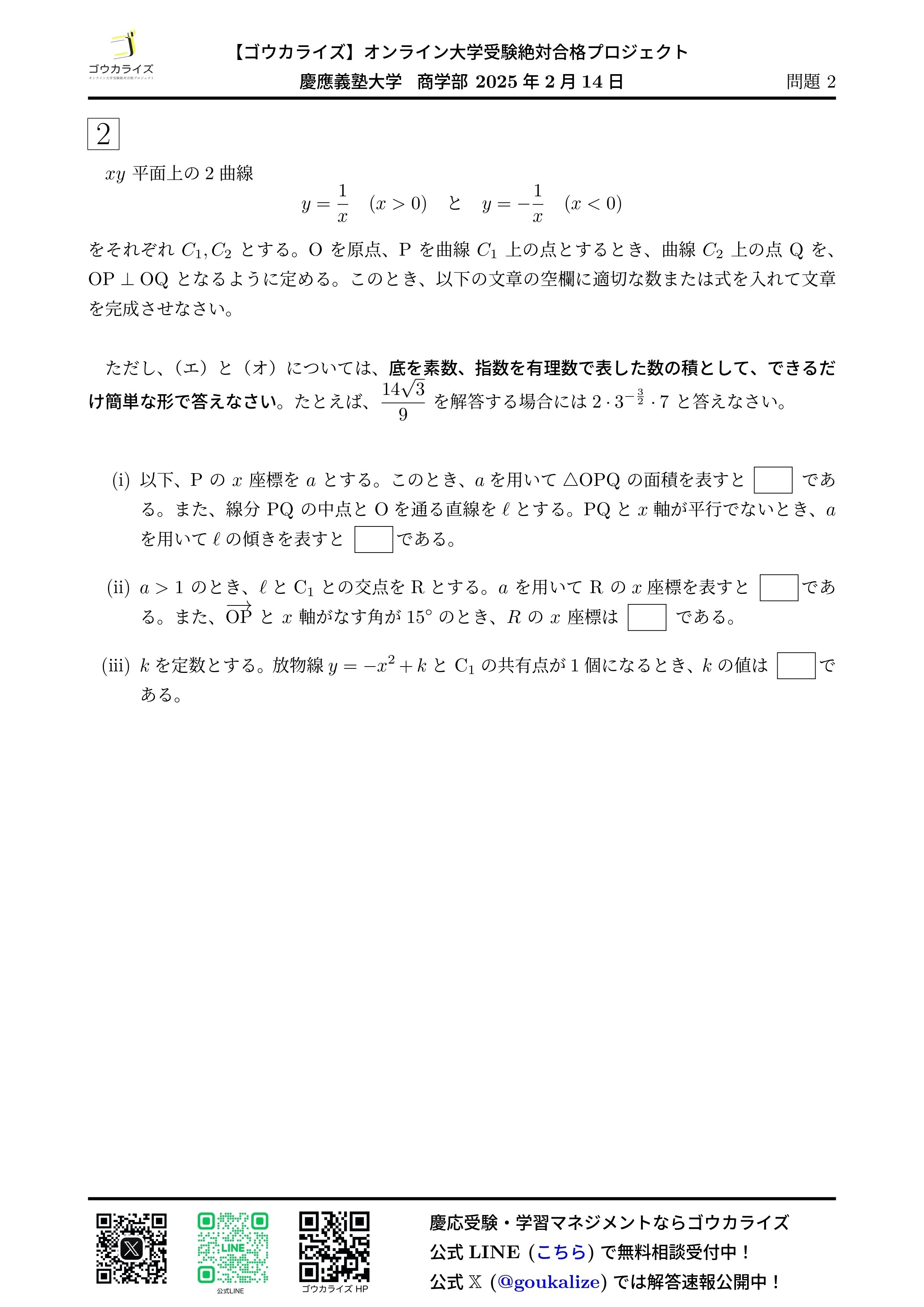 慶應義塾大学 商学部 2025年(2/14) 数学 解答速報
