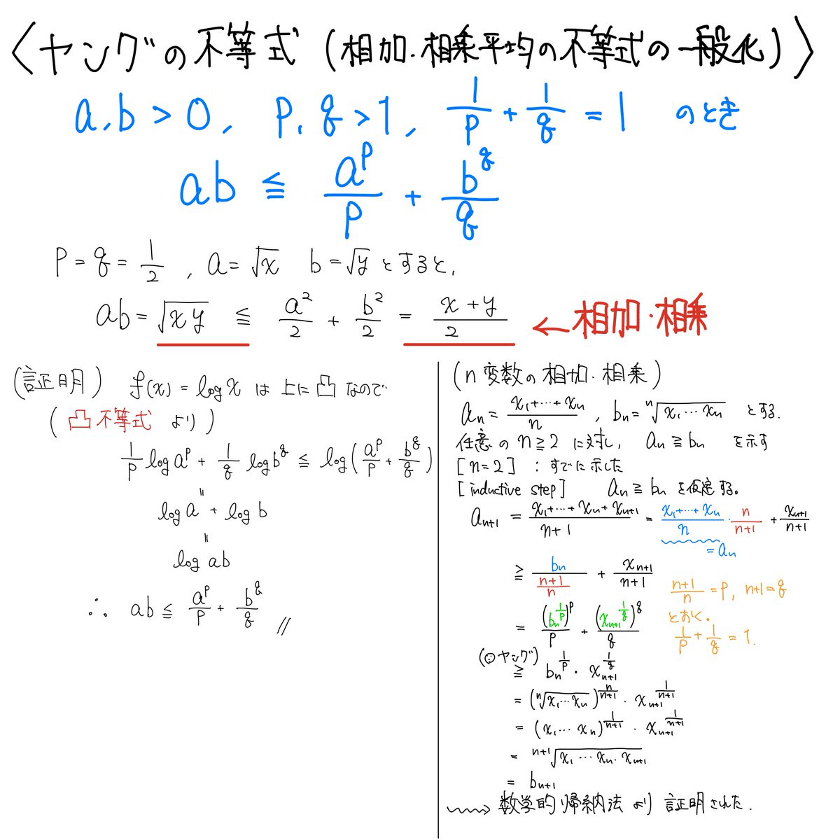 すでに紹介したn変数の相加相乗平均の大小関係も、ヤングの不等式を用いることで証明できます。