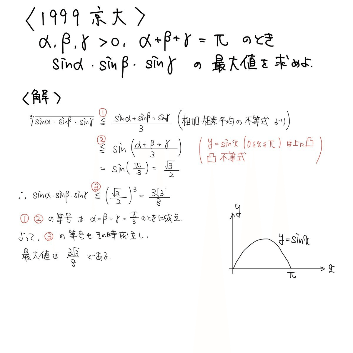 凸不等式は、上に凸 (または下に凸)の関数に対して成立する不等式で、受験でもしばしば使われることがあります。