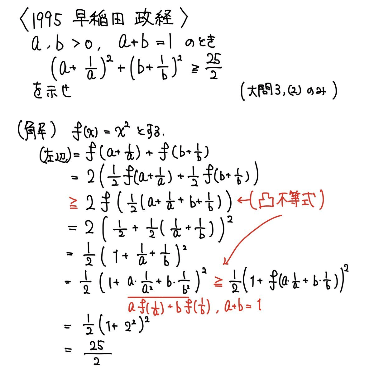 そこで、ゴウカライズ講師のkinseiさんが「凸の定義」としてよく使われるものと、その便利な言い換えを解説し、凸不等式を証明したpdfを作成しました。