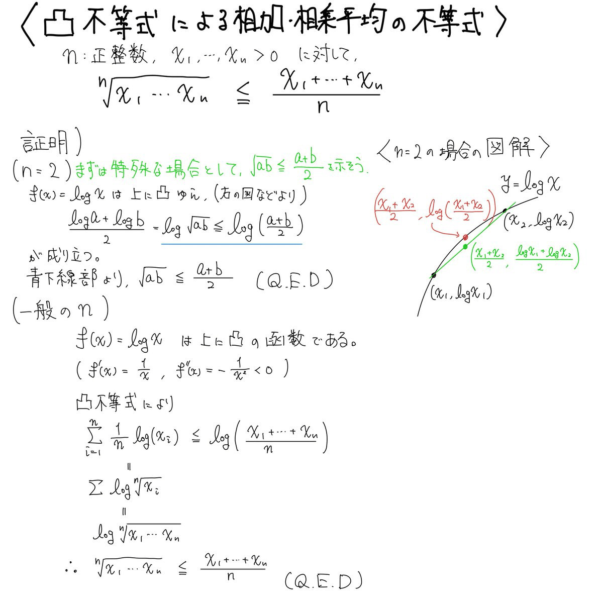 まずは相加・相乗平均の大小関係(一般形)の証明です。logの凸性の利用はしばしば用いられます。