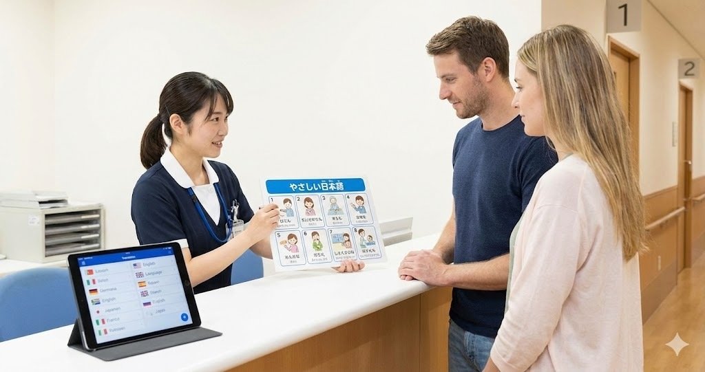 医療機関の対応策として、医療通訳サービス(電話・ビデオ通話で通訳者につなぐ)、多言語問診票・指さしシート(症状を選んでもらう)、翻訳アプリの活用があります。ただし、医療機関によって整備状況には差があり、医療通訳や多言語ツールを含む受入れ体制づくりが課題になっています。