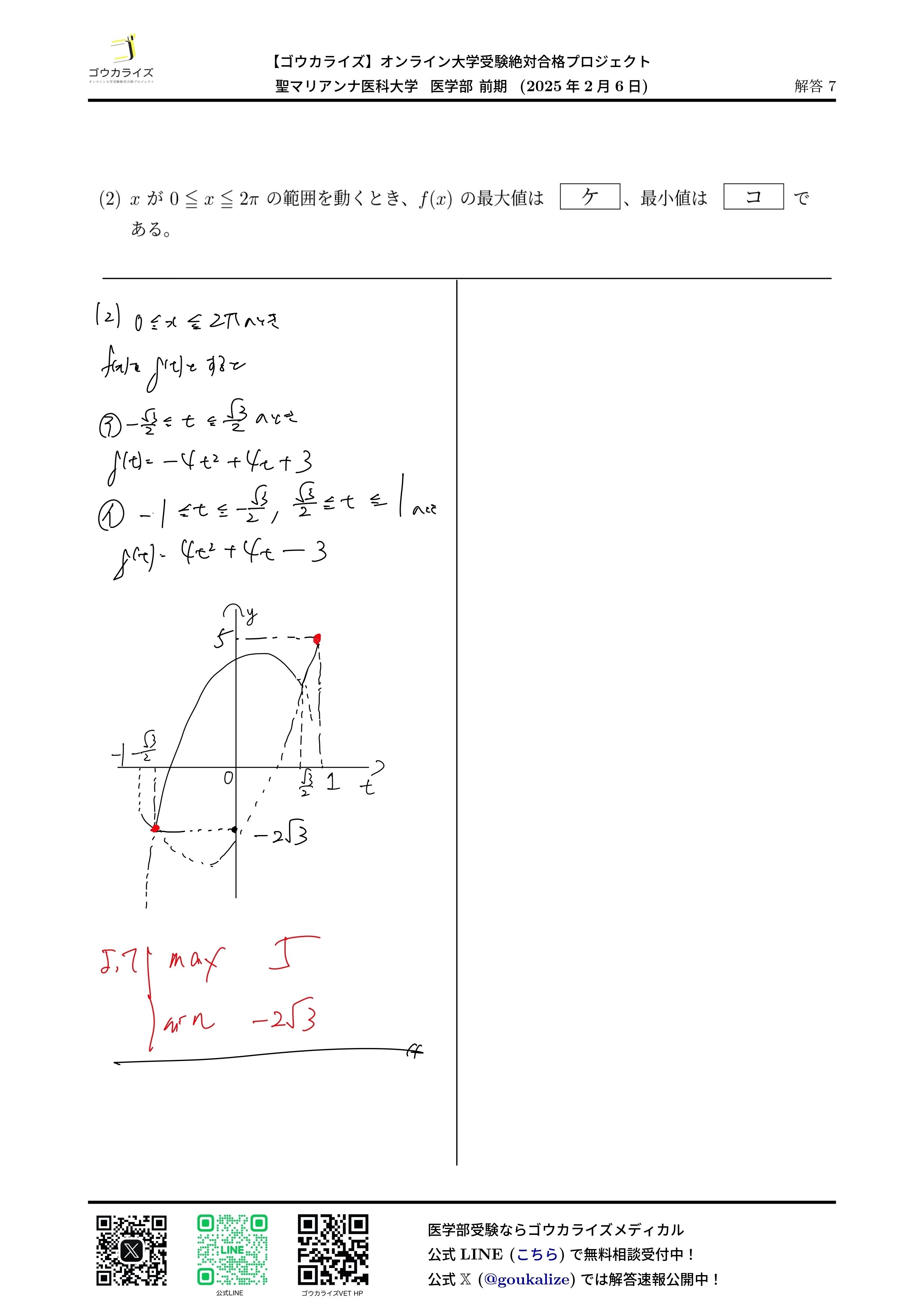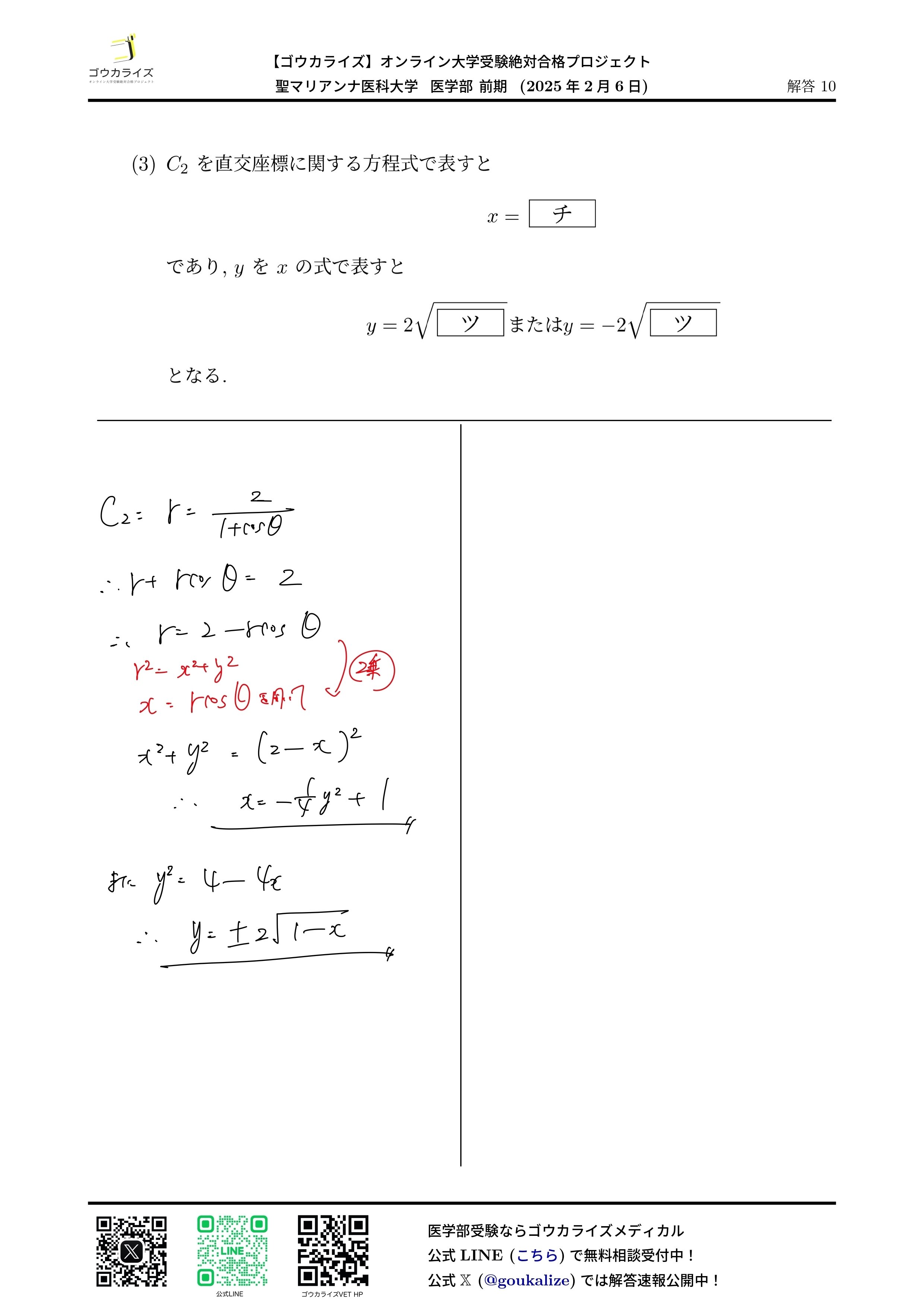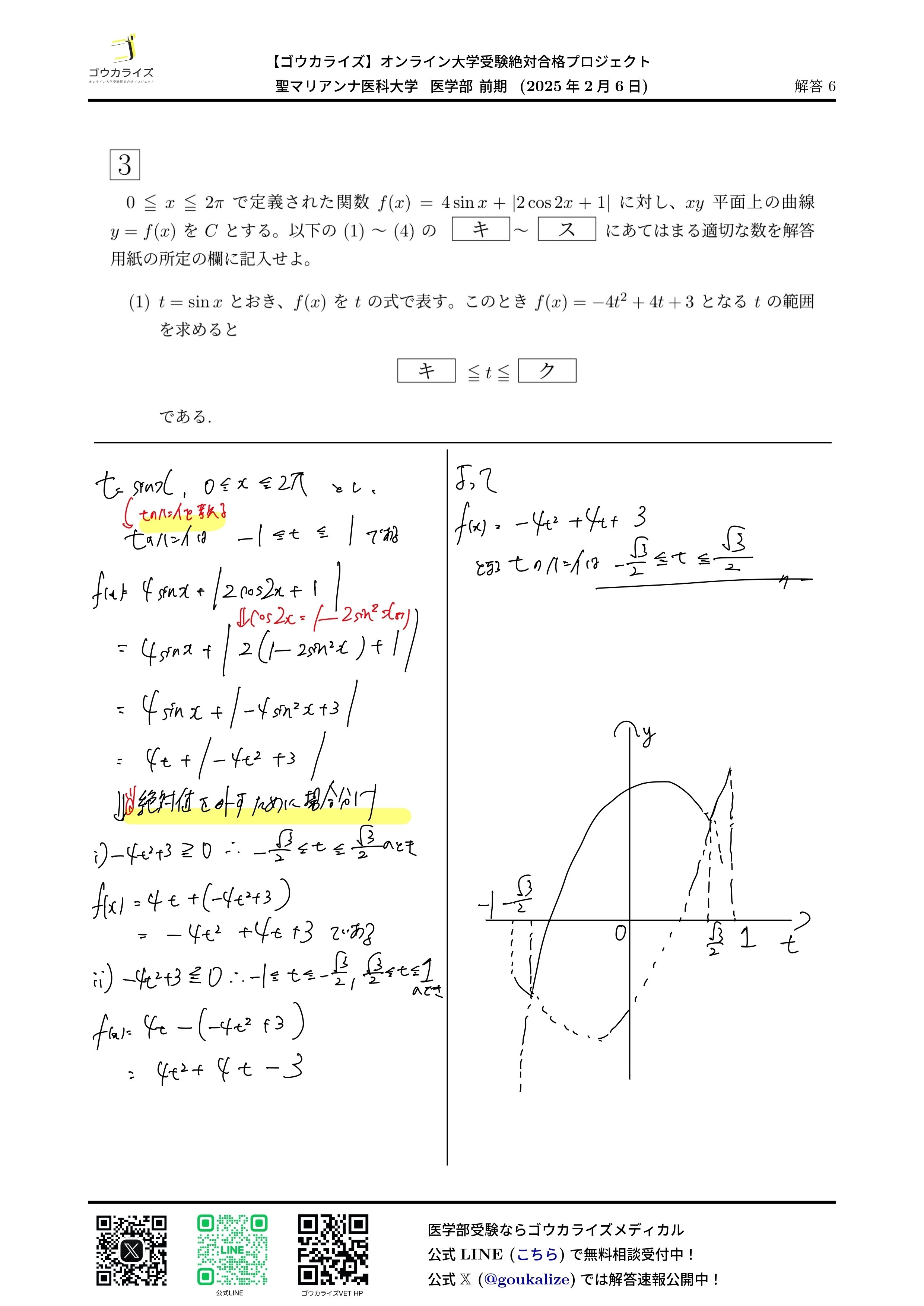聖マリアンナ医科大学 医学部 前期 2025年(2/6) 数学 解答速報