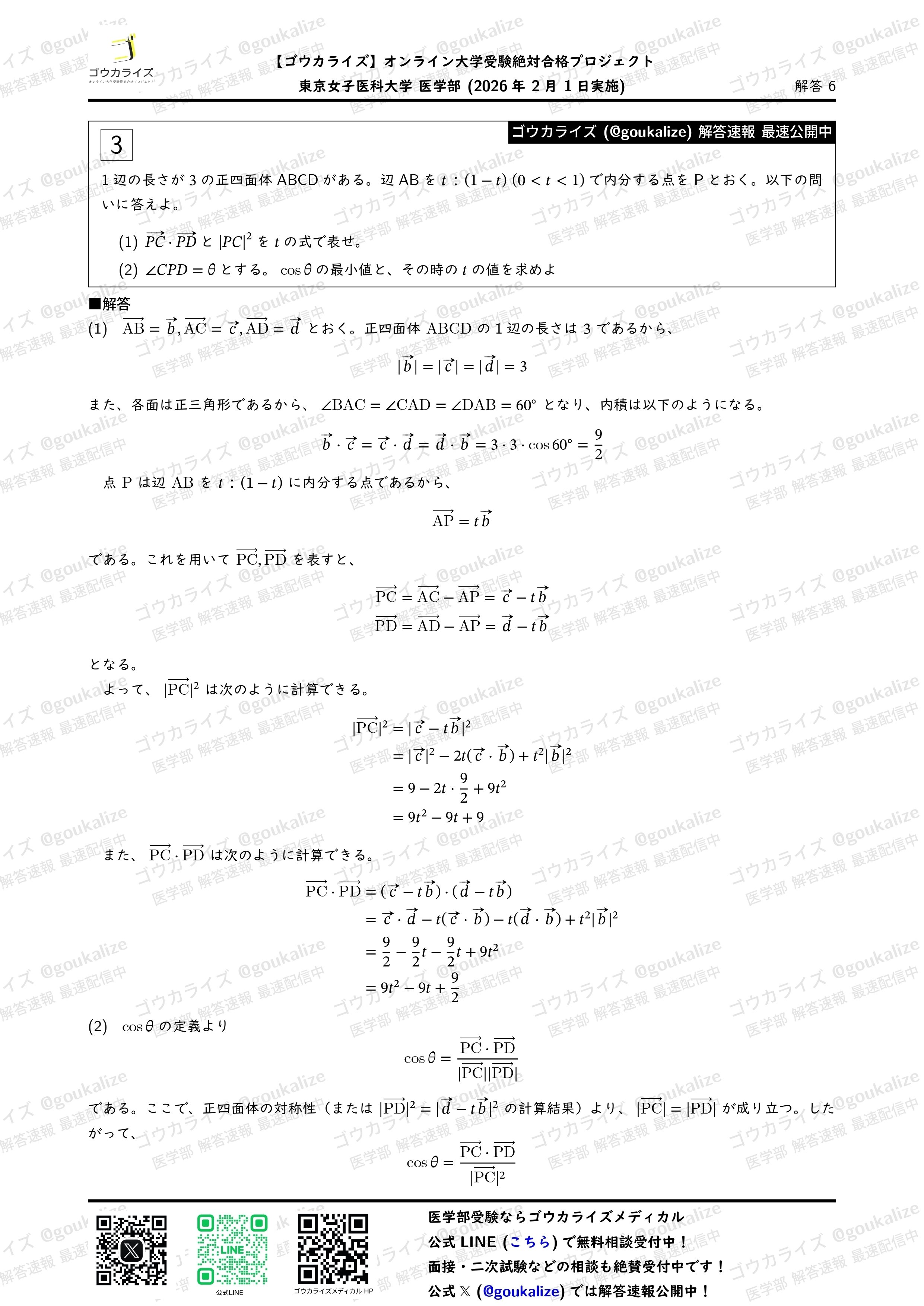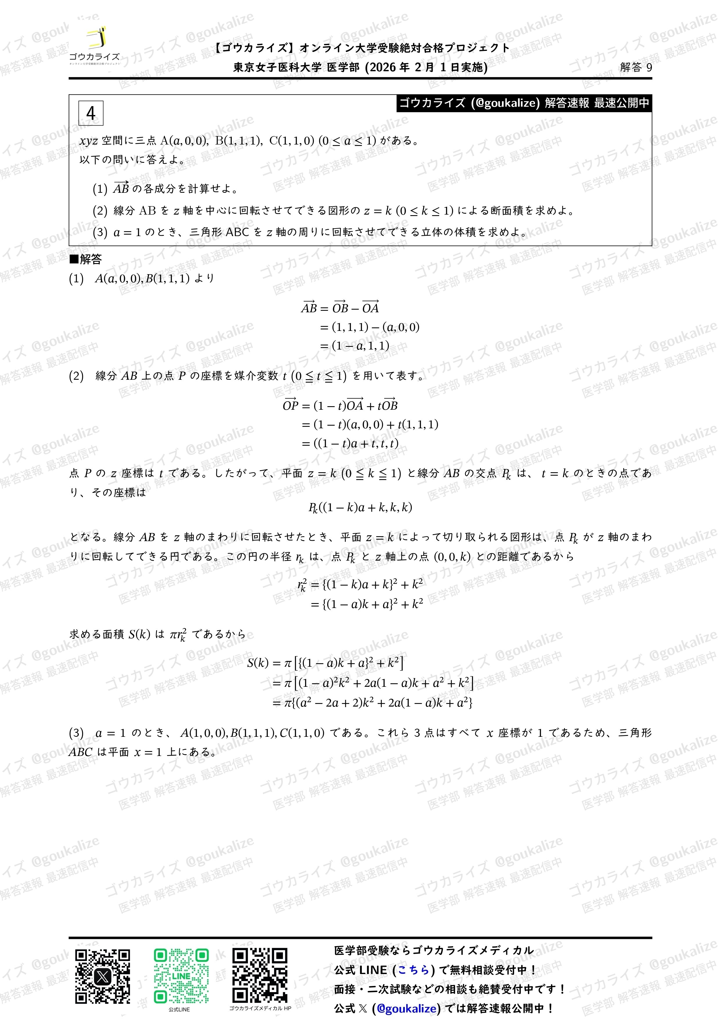 2026/2/1実施の東京女子医科大学 医学部の数学の解答速報です。