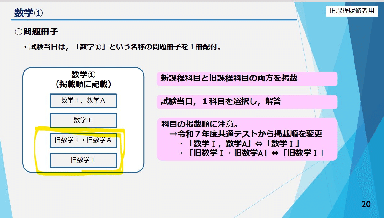 今年は新課程の数1Aが冊子の先頭です。数1と数1Aの順番が以前と逆になったことに注意しましょう。(数学②は 新課程数2BCが先頭)