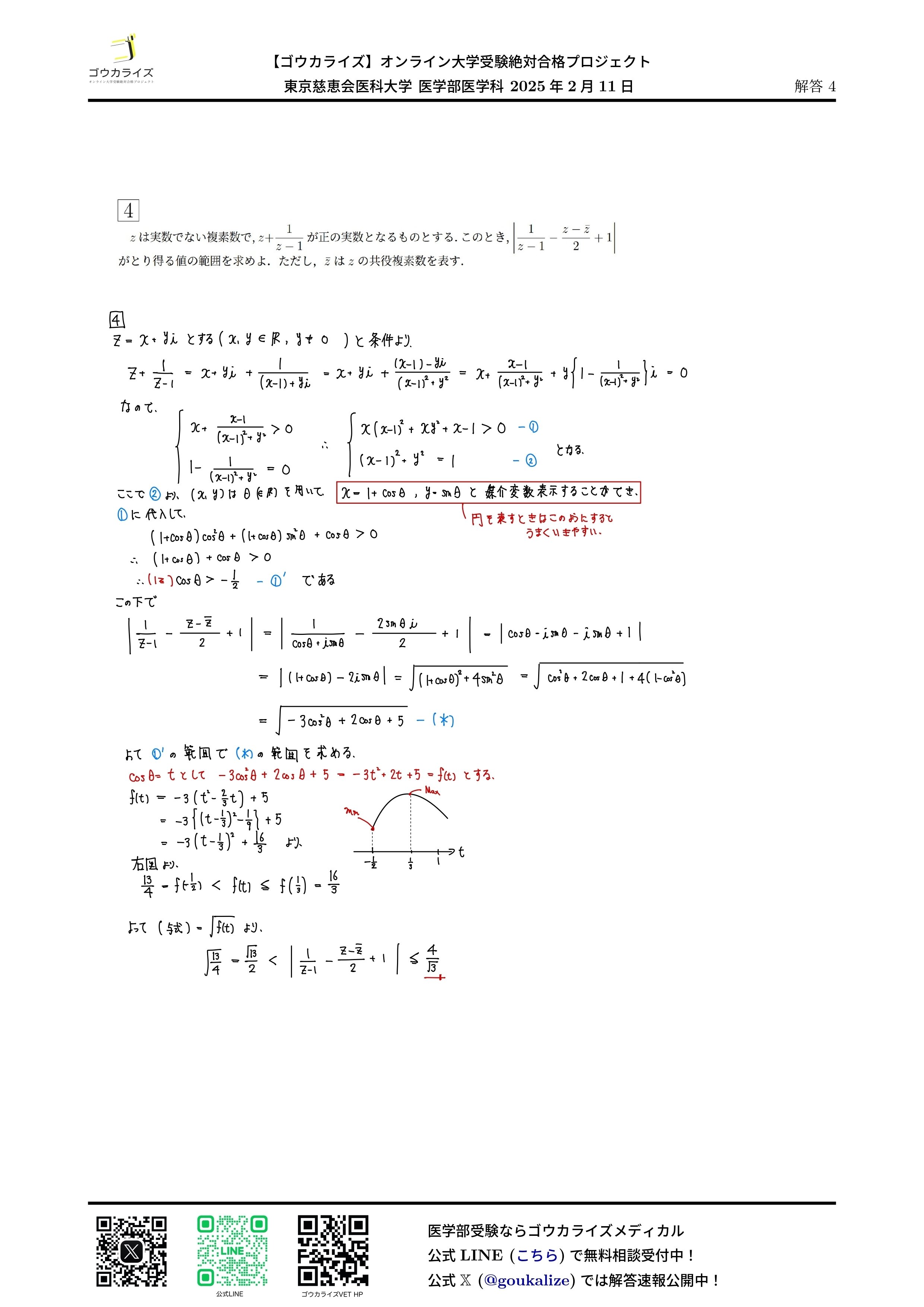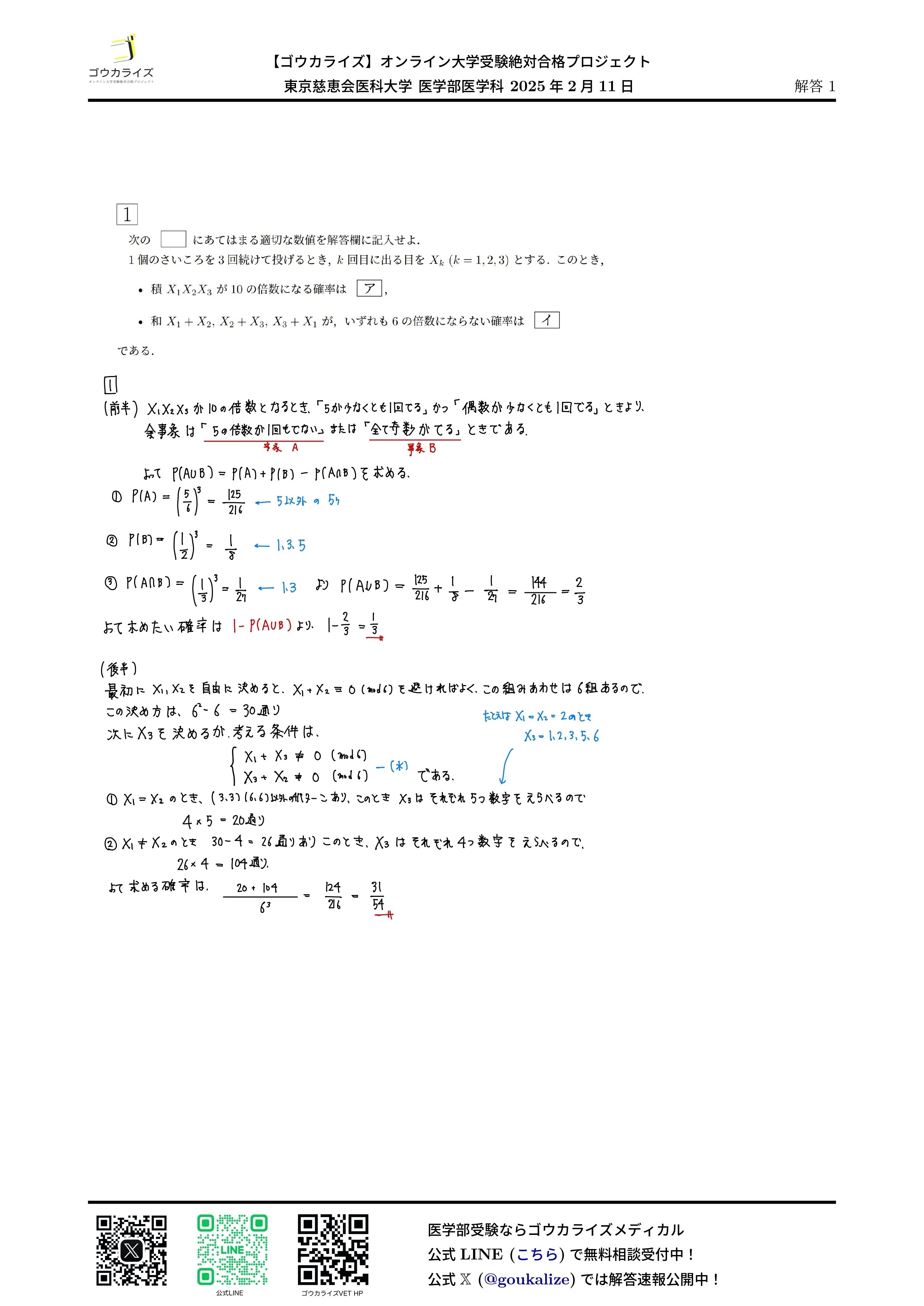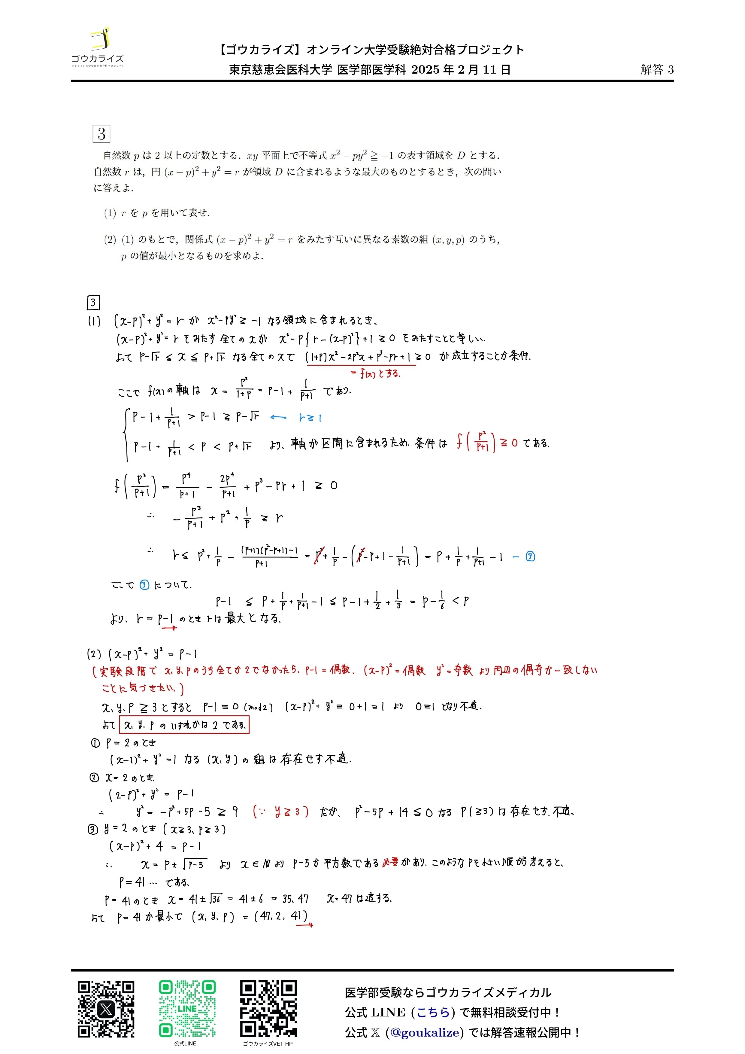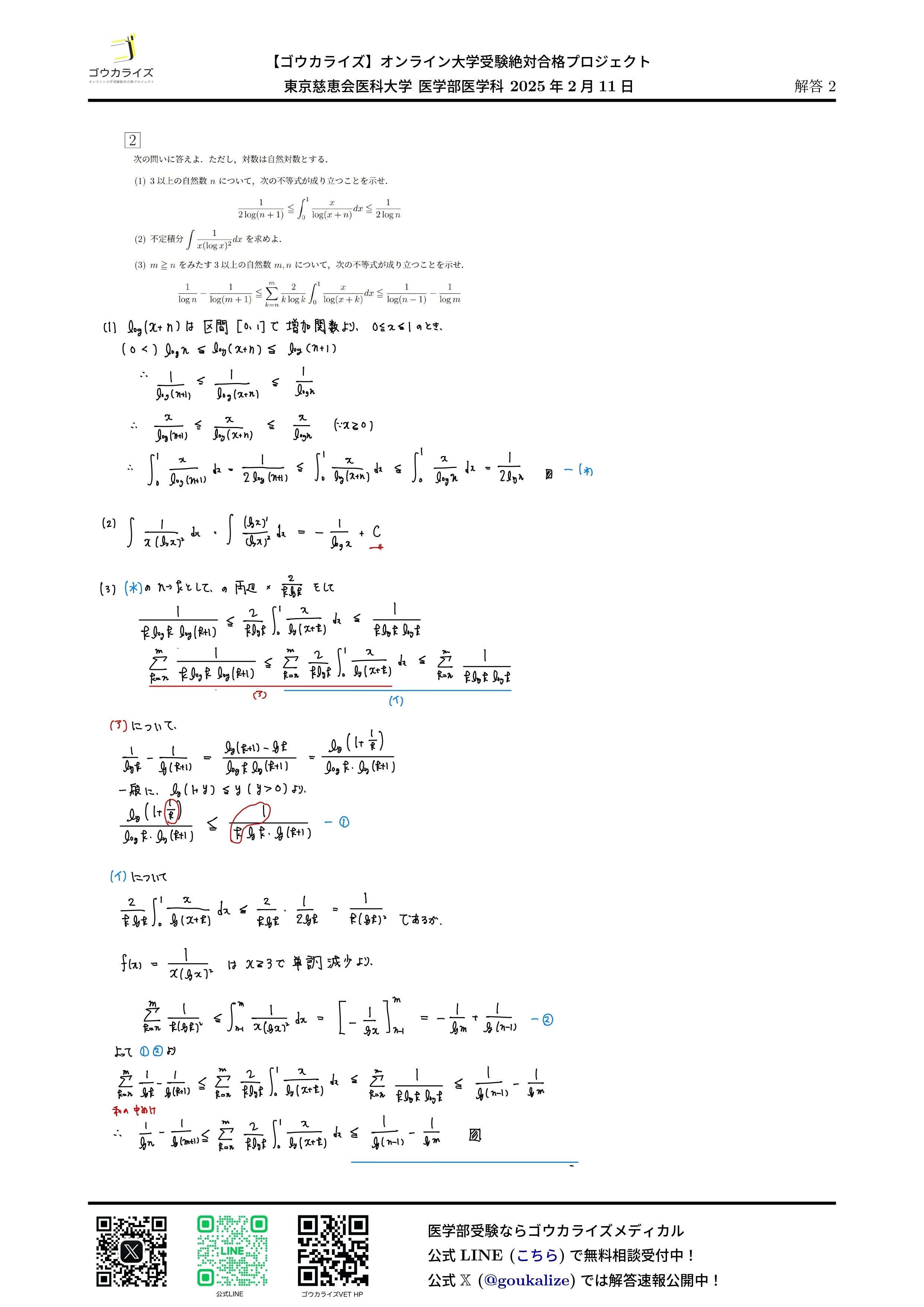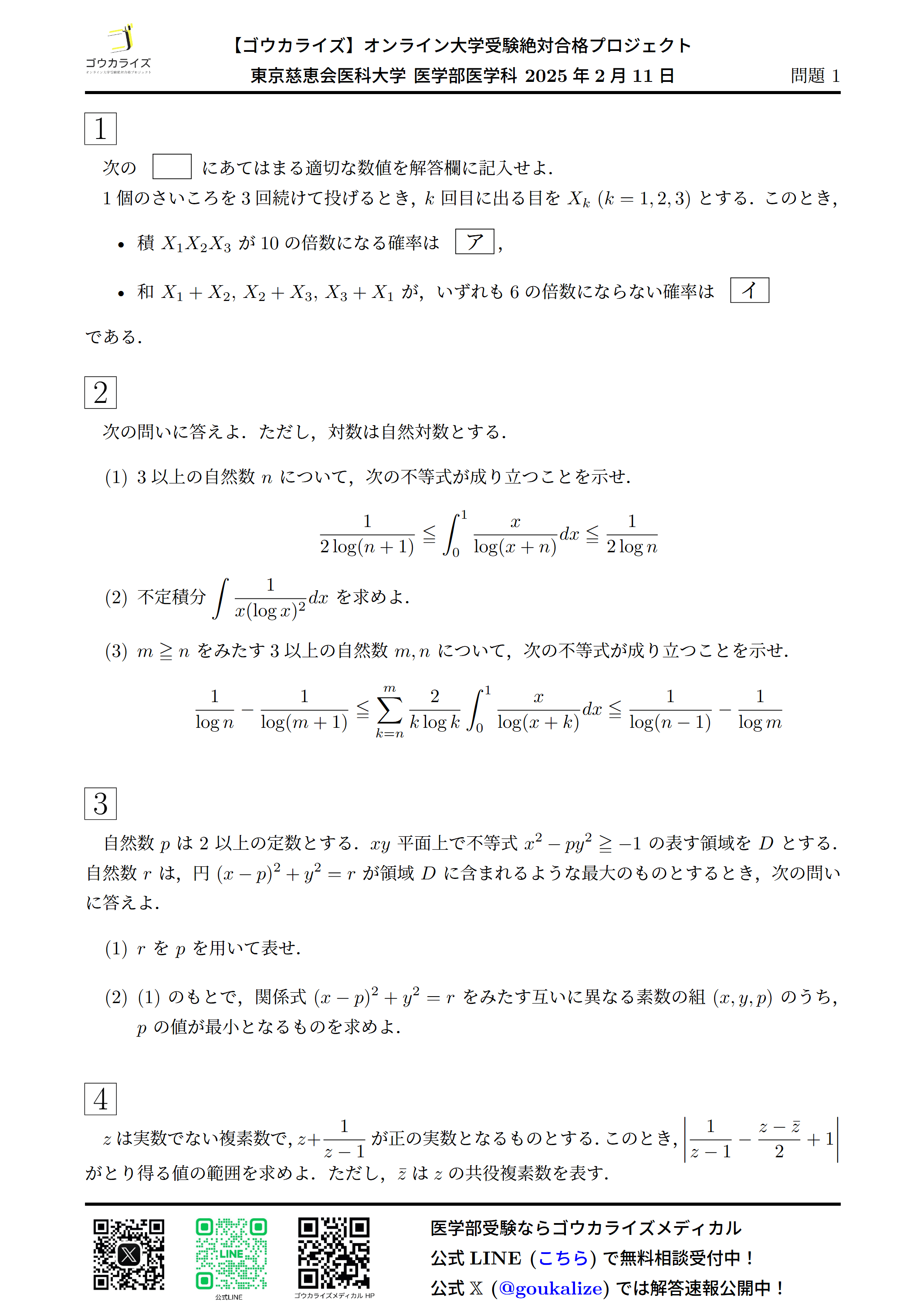 2025年2月11日 行われた 東京慈恵会医科大学 医学部医学科の数学解答速報です。