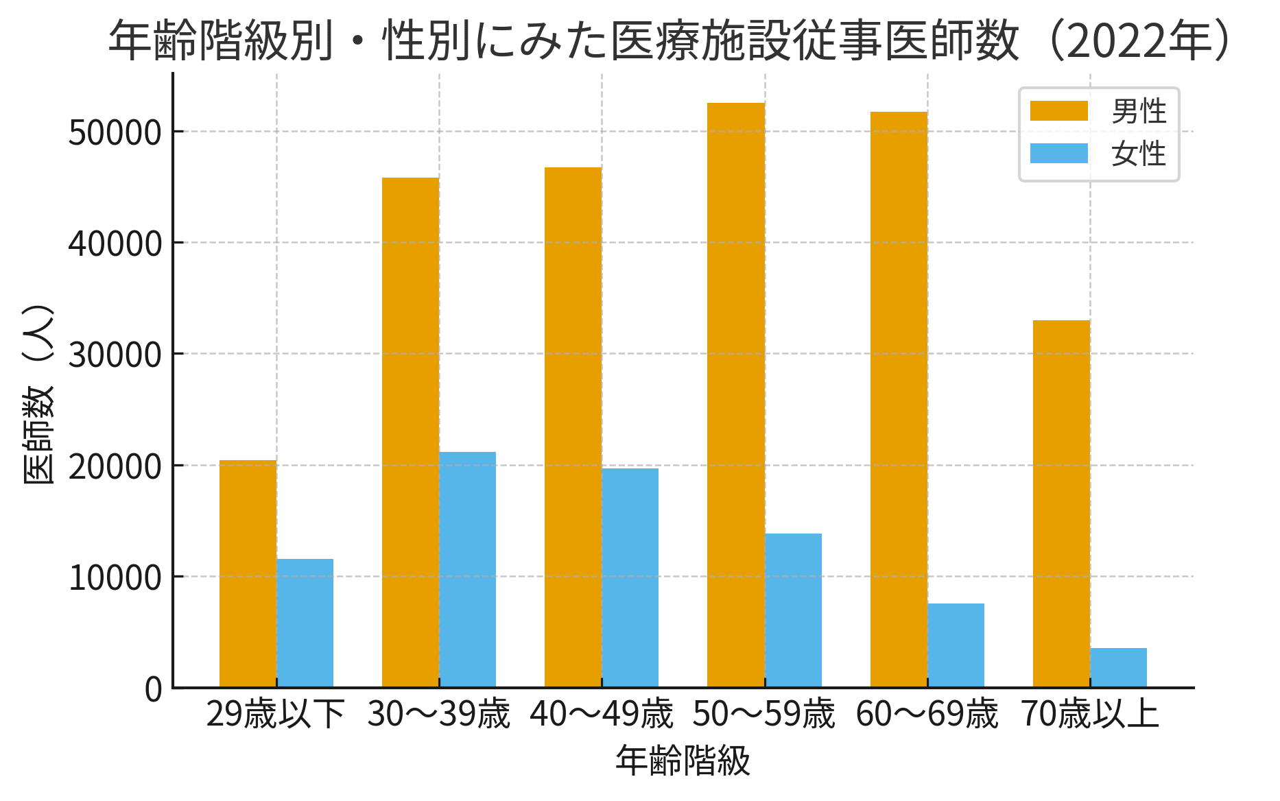 この分布は、若い女性医師が増えているにもかかわらず、中堅以降で定着していないことを示す。背景には、当直や長時間労働が常態化した医療現場と、出産・育児期が重なる30〜40代に負担が集中する勤務形態がある。薬剤師では女性多数が維持されていることから、医師に特有の勤務実態が女性の継続就業を妨げている可能性は高い。女性だけに家事・育児負担が偏る社会規範も、キャリア形成を阻む要因と言える。