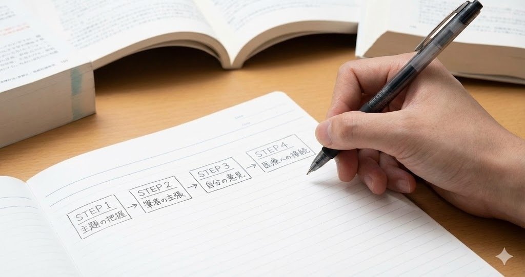 主題の把握→筆者の主張→自分の意見→医療への接続、の4ステップで考えをまとめましょう。
