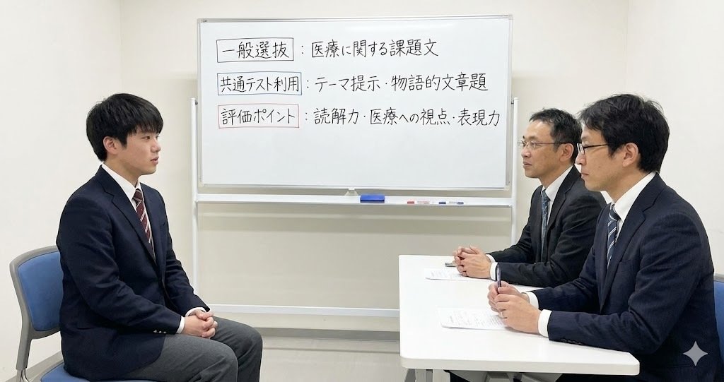 東京医科大学医学部の面接では、「課題文を読んで答える形式」が大きな特徴です。一般選抜では医療に関する課題文、共通テスト利用選抜では「クオリティ・オブ・デス」などのテーマ提示や物語的な文章題が出題されています。