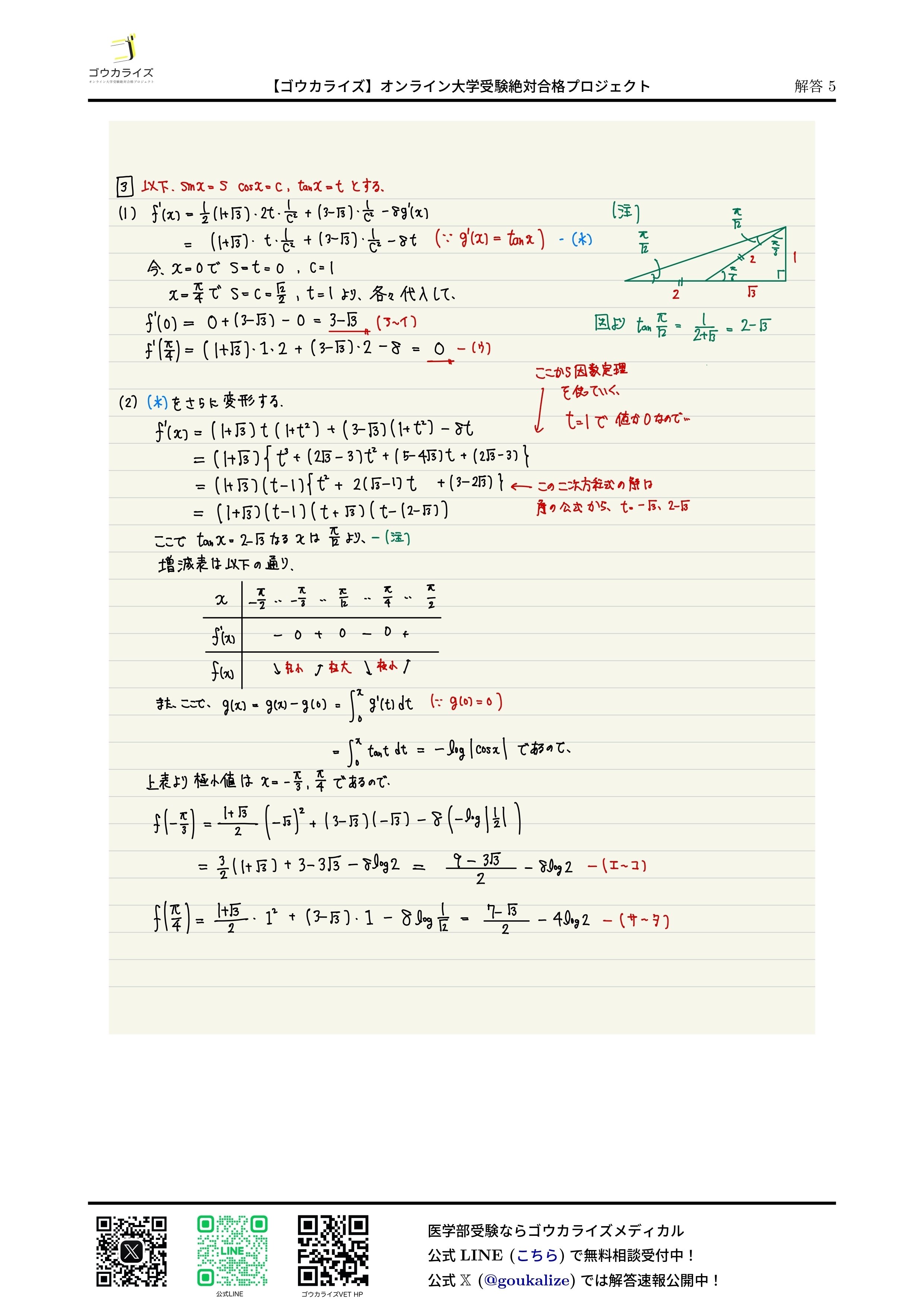 (2)(3)に関しては1度tanのみの形にして高次方程式を解くといいが、ルートが絡んでおり少し複雑。また、tan pi/12の値を知らないと詰まるポイントがあり、少し不親切だと思った。そこさえ乗り切ればあとは普通の極値を求める問題である。