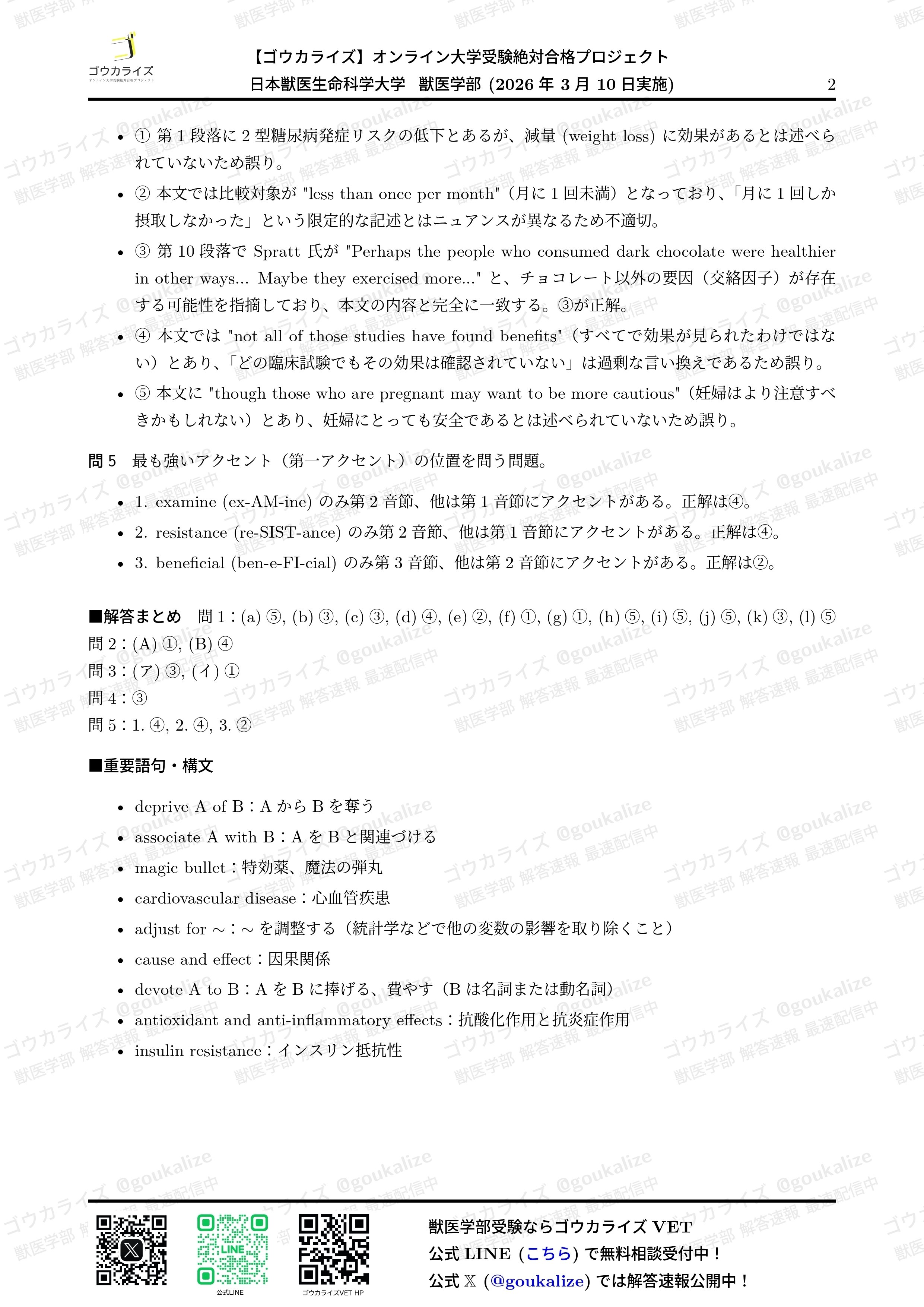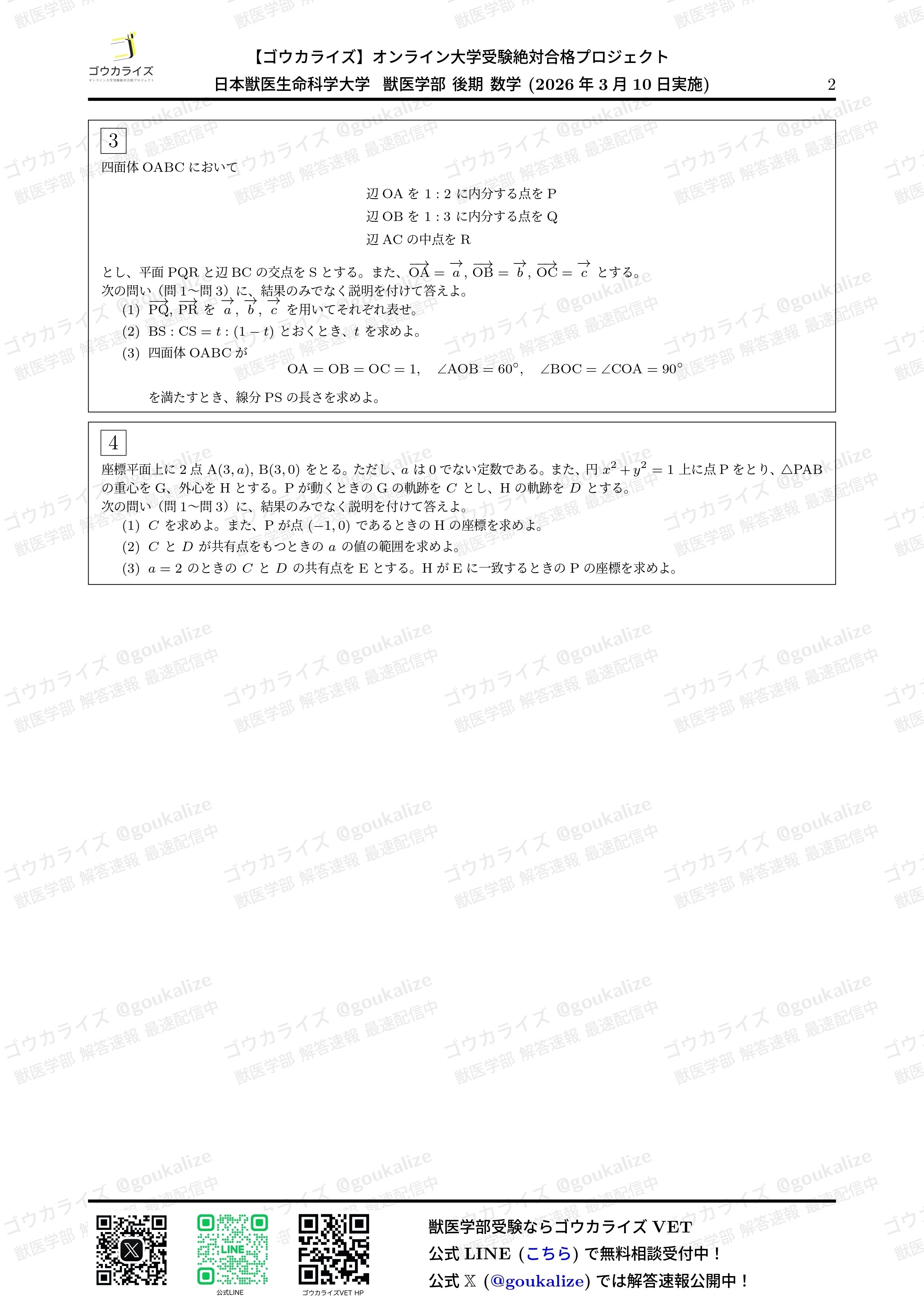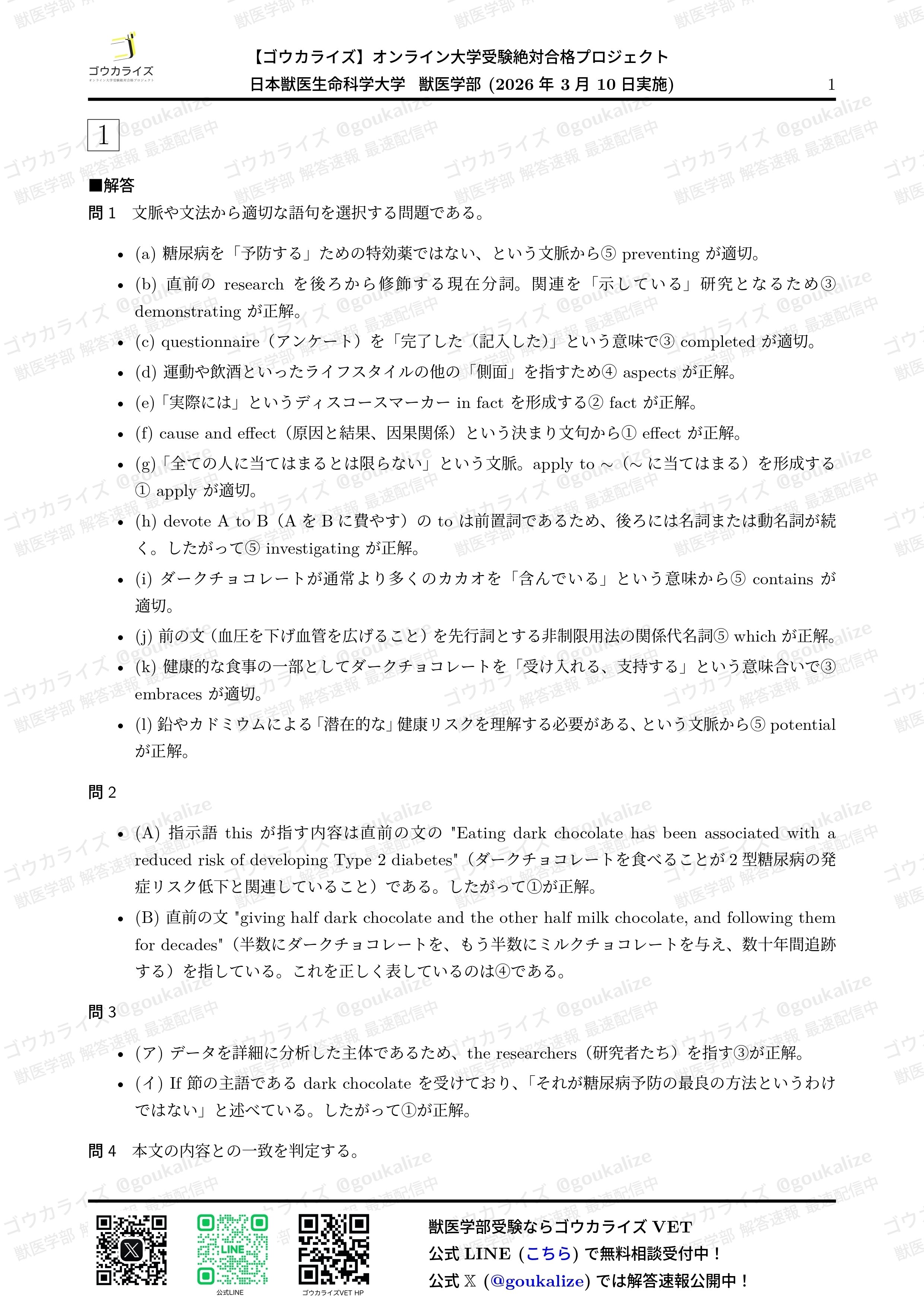オープンチャット「【ゴウカライズ】2026年 獣医学部 解答速報」